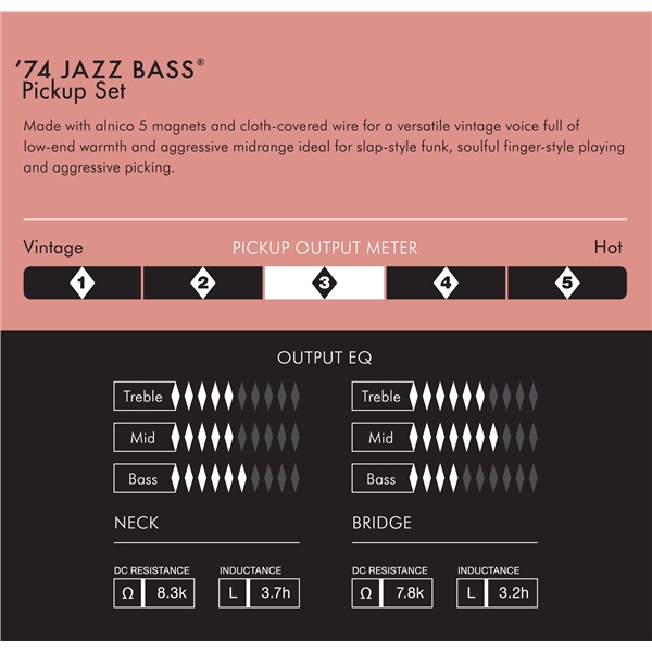 Súprava snímačov na elektrickú basgitaru Tieto snímače Fender nájdete na basgitarách Fender American Vintage '74 Jazz. Vyznačujú sa veľmi univerzálnym zvukom, teplými basmi a výraznými stredmi. Sú ideálne na slap a všeobecne na hranie funkových žánrov. Oba snímače sú súčasťou balenia. – Magnet Alnico V – Ekvalizácia: krk – 6/5/5, hlavica – 4/7/6 – Jednosmerný odpor: krk – 8,3k ohmov, mostík – 3,2k ohmov