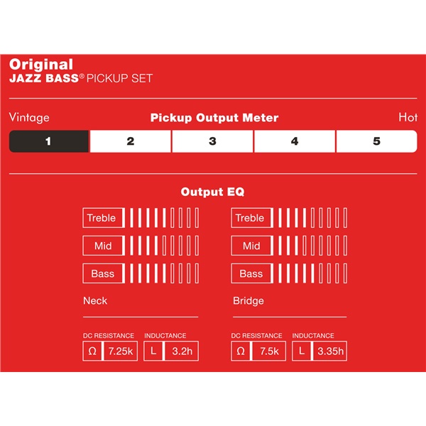Súprava snímačov na elektrickú basgitaru Tieto snímače Fender nájdete na basgitarách Fender American Vintage '74 Jazz. Vyznačujú sa veľmi univerzálnym zvukom, teplými basmi a výraznými stredmi. Sú ideálne na slap. Oba snímače sú súčasťou balenia. – Alnico II magnet – Ekvalizácia: krk – 6/5/6, hlavica – 645 – Jednosmerný odpor: krk – 7,5k Ohmov, mostík – 7,25k Ohmov
