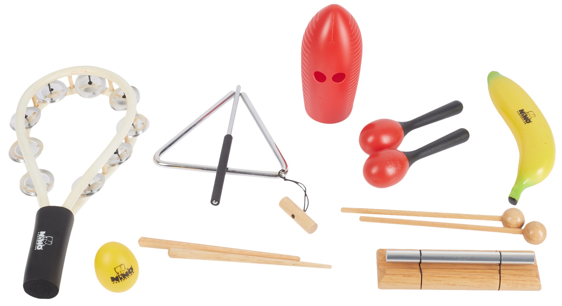 Perkusová sada Táto súprava bicích nástrojov patrí do značky Nino Percussion spoločnosti Meinl. Tieto bicie nástroje sú vhodné nielen pre deti, ale aj pre všetkých ostatných hudobníkov, ktorí hľadajú lacné, ale kvalitné nástroje. V tejto sade nájdete: – Drevené guiro s paličkou vyrobené z kaučukového dreva, ktoré mu dodáva príjemný a prirodzený zvuk – Oceľový triangel s dreveným držiakom, ktorý ponúka čistý zvuk s dlhým sustainom. Súčasťou balenia je aj kovová palička s pogumovaným koncom – Pár plastových m