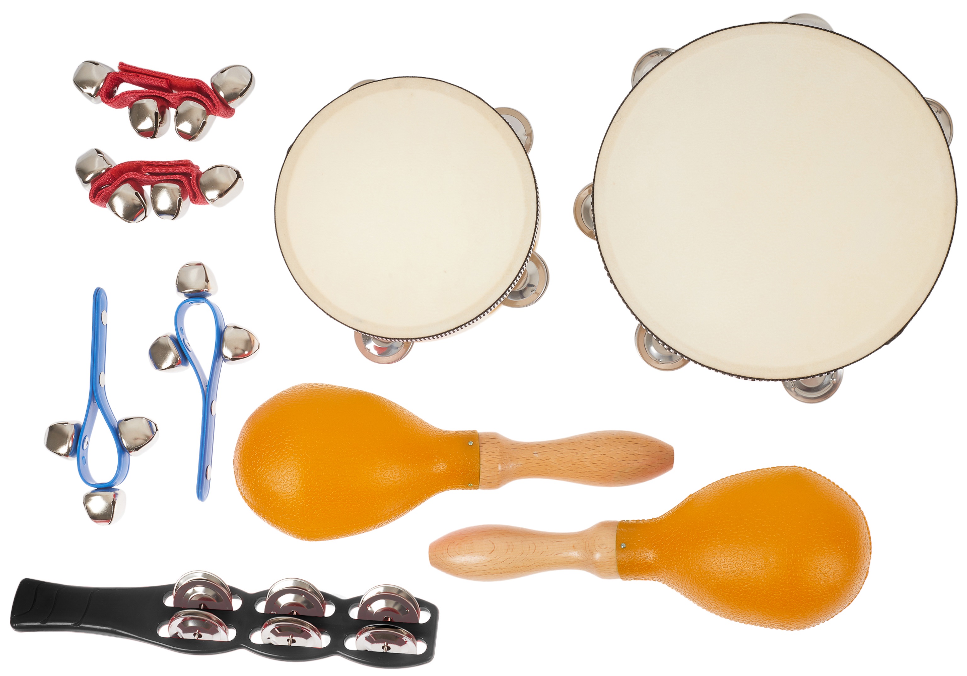 Perkusová sada Obsah balenia: 2 páry prstových činelov 1x gong s 8 notami 3 páry zvonkohier 1x 15 cm tamburína 1x 20 cm tamburína 1x drevený blok s paličkou 2x prstové kastanety 1x zvonček s rukoväťou 2x zvony 2x 10 cm trojuholník 2x 15 cm trojuholník 1x Agogo s paličkou 1x pár maracas 1x Jingle stick – tamburína 1x sánkové zvony 1x blok s 2 poznámkami 1x plastové puzdro na prenášanie