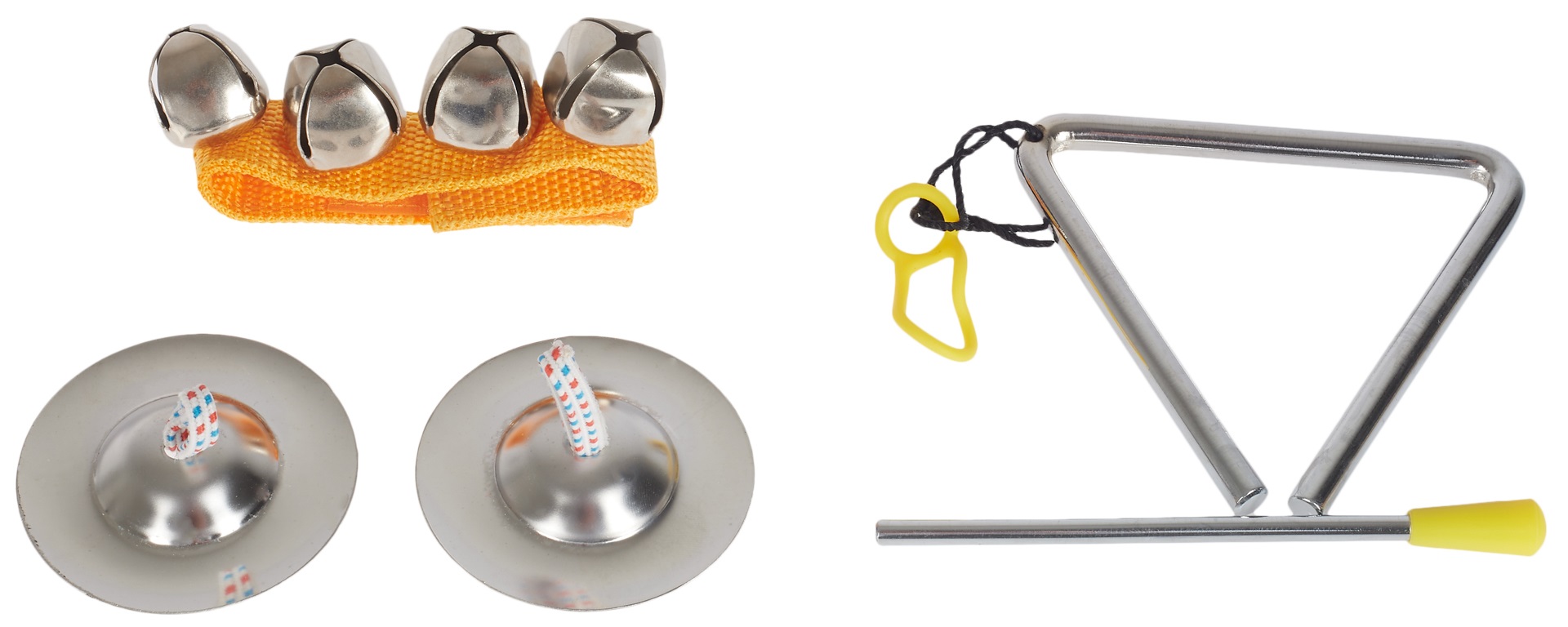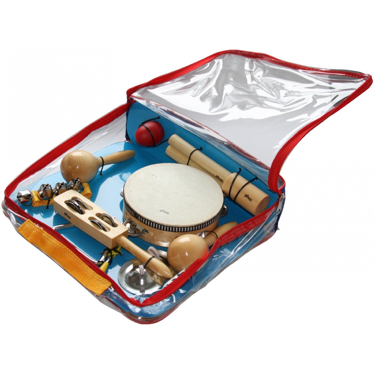 Perkusová sada Malá bicia súprava vhodná pre deti od troch rokov. Nájdete tu triangel, drevené klavesnice, 6-palcovú tamburínu, pár maracas, drevený šejker, plastový šejker, zvončeky a pár náprstkových činelov.