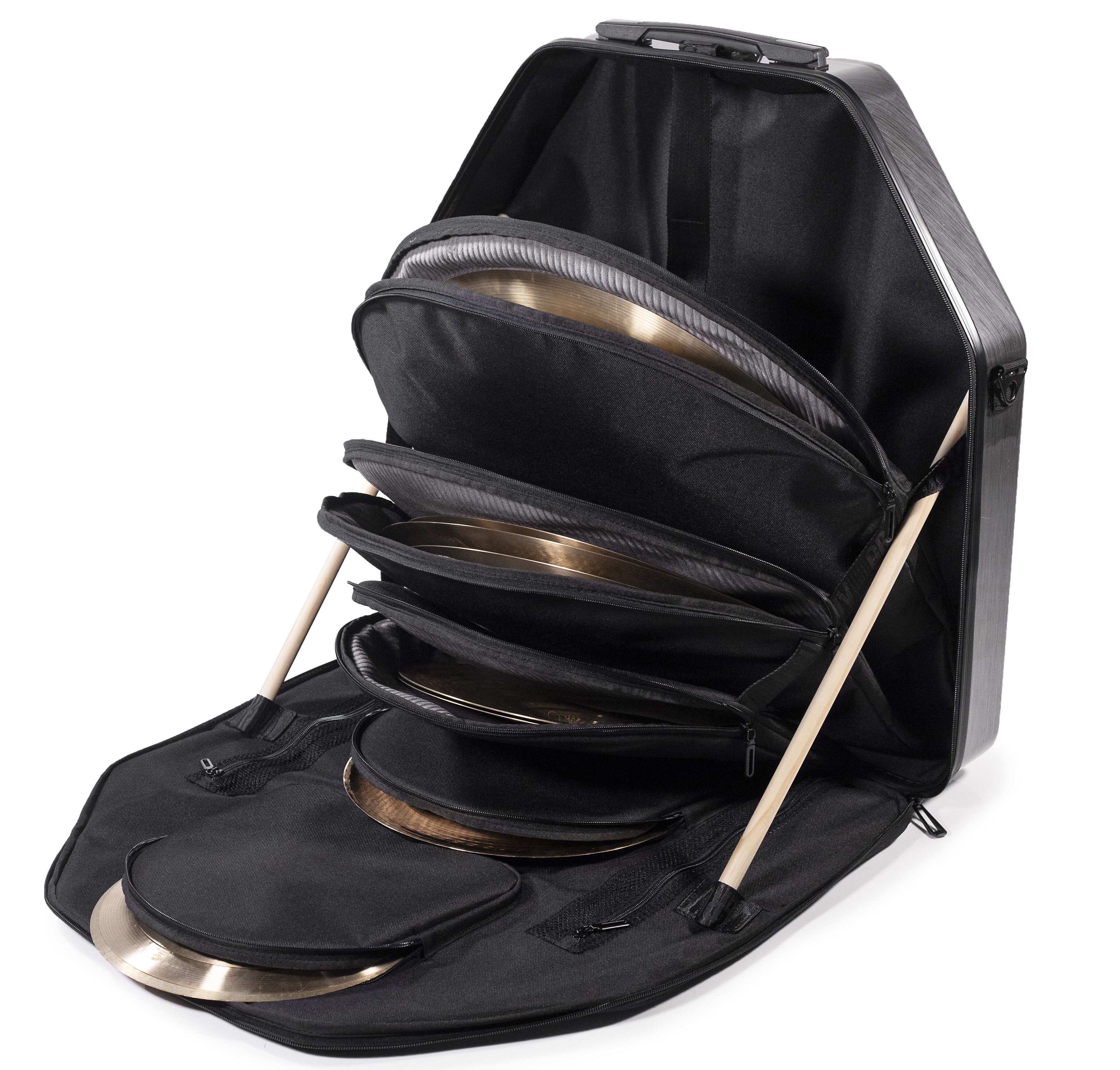Pevný obal na činely Táto nová súprava poťahov Gruvgear s revolučným dizajnom určite uľahčí život mnohým bubeníkom. Hybridné kryty Veloc kombinujú odolnosť pevných krytov pri zachovaní nízkej hmotnosti. Sú vyrobené z nepremokavej tkaniny 1680D a jednu stranu majú z odolného ABS/polykarbonátového plastu. Výhodou je, že sa dajú ľahko pripevniť k prepravnému vozíku pomocou magnetického systému, takže môžete bezpečne a pohodlne prepravovať celú súpravu vrátane hardvéru naraz. Vďaka ich špeciálnej patentovanej k