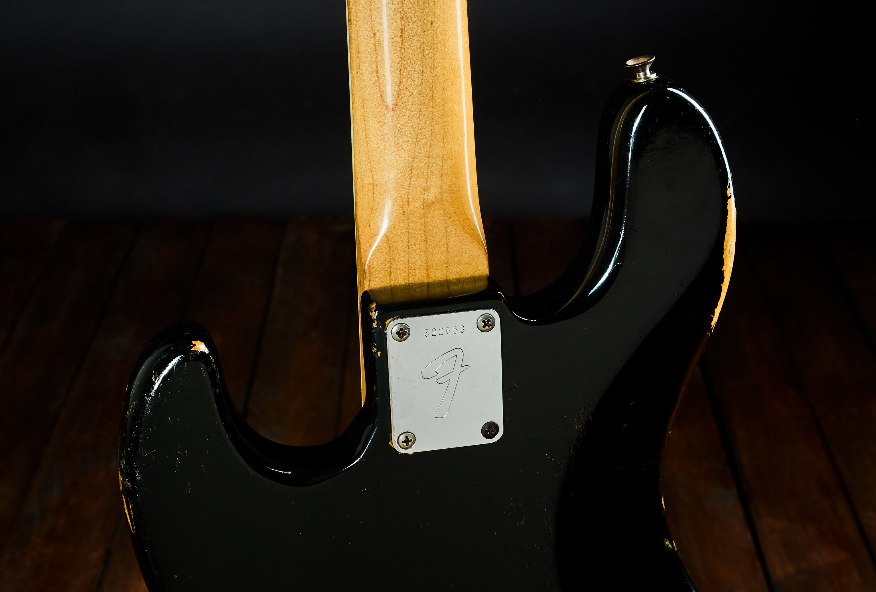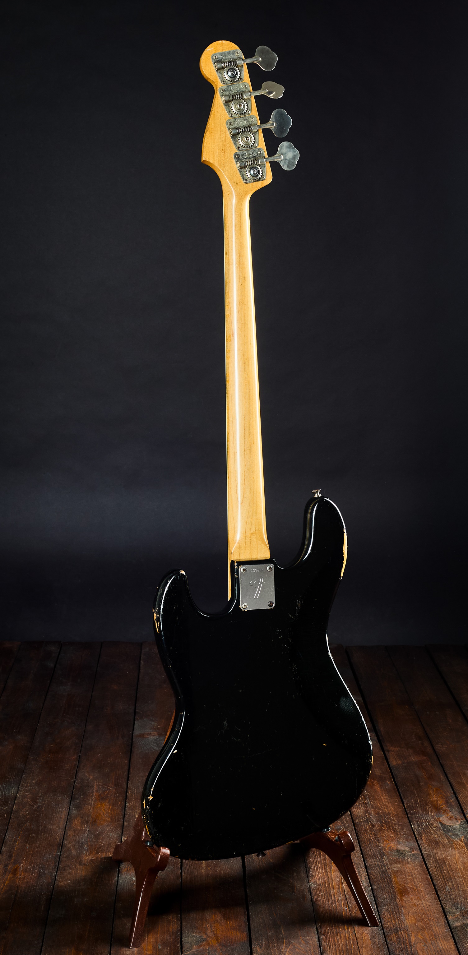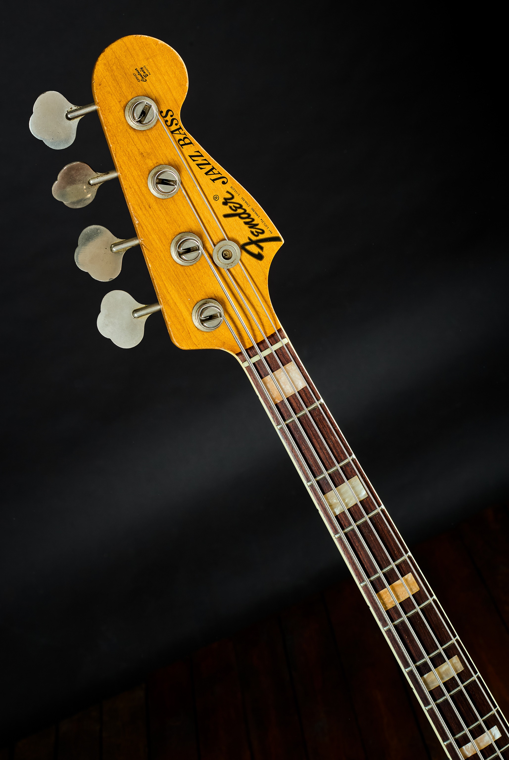 Elektrická basgitara Fender Jazz Bass z roku 1971 v menej bežnej čiernej farbe. Čo na to povedať? – Toto je skutočný príklad basgitary tak, ako má vyzerať a znieť. Tento zberateľský nástroj má za sebou bohatý život, napriek tomu je v perfektnom hrateľnom stave, stačí ho len chytiť a hrať. Potenciometre sú z roku 1971, pickguard je tiež vyrazený na rovnakú éru, dátum na krkovom snímači je nečitateľný, ale vyzerá rovnako, tiež pôvodný. Lak na tele je zákazkový čierny, s dobovým zložením – spodná vrstva číreho