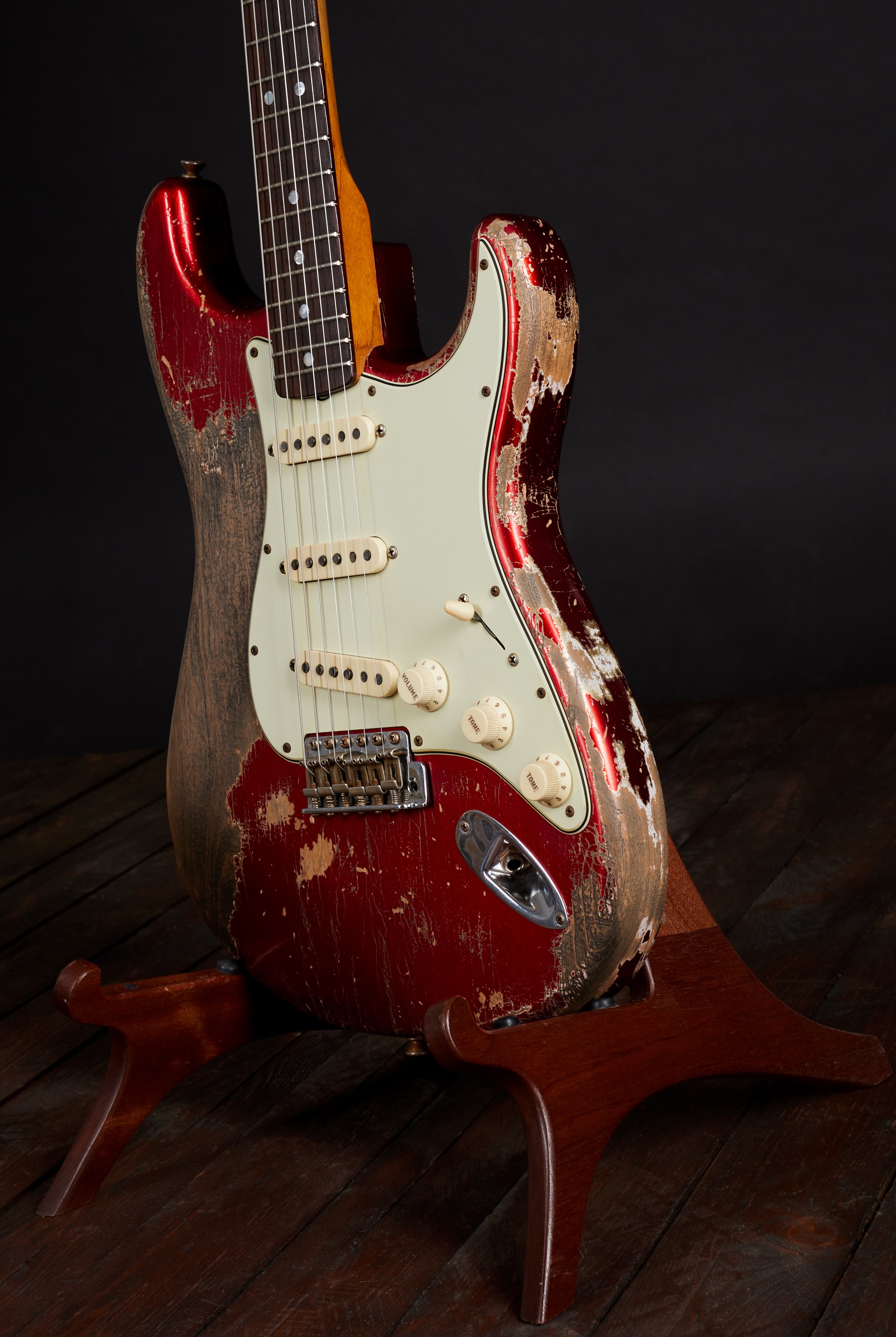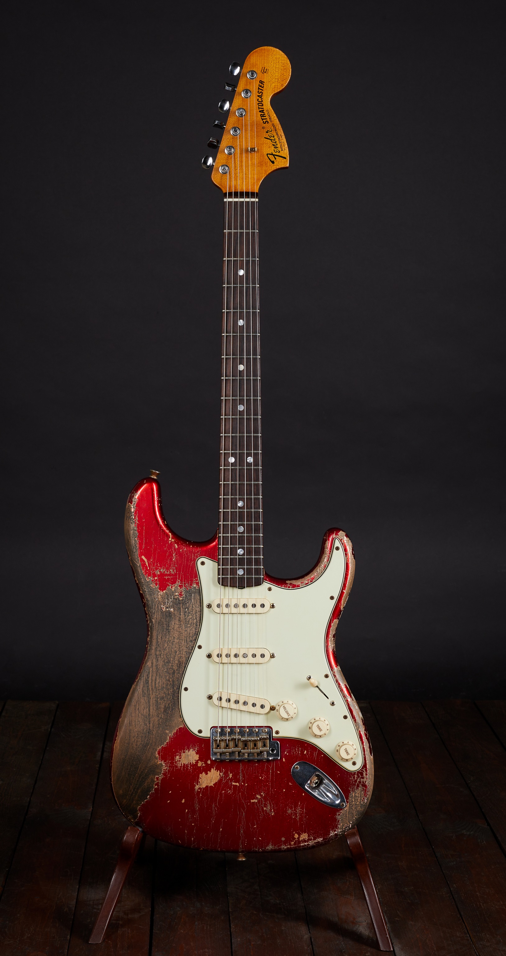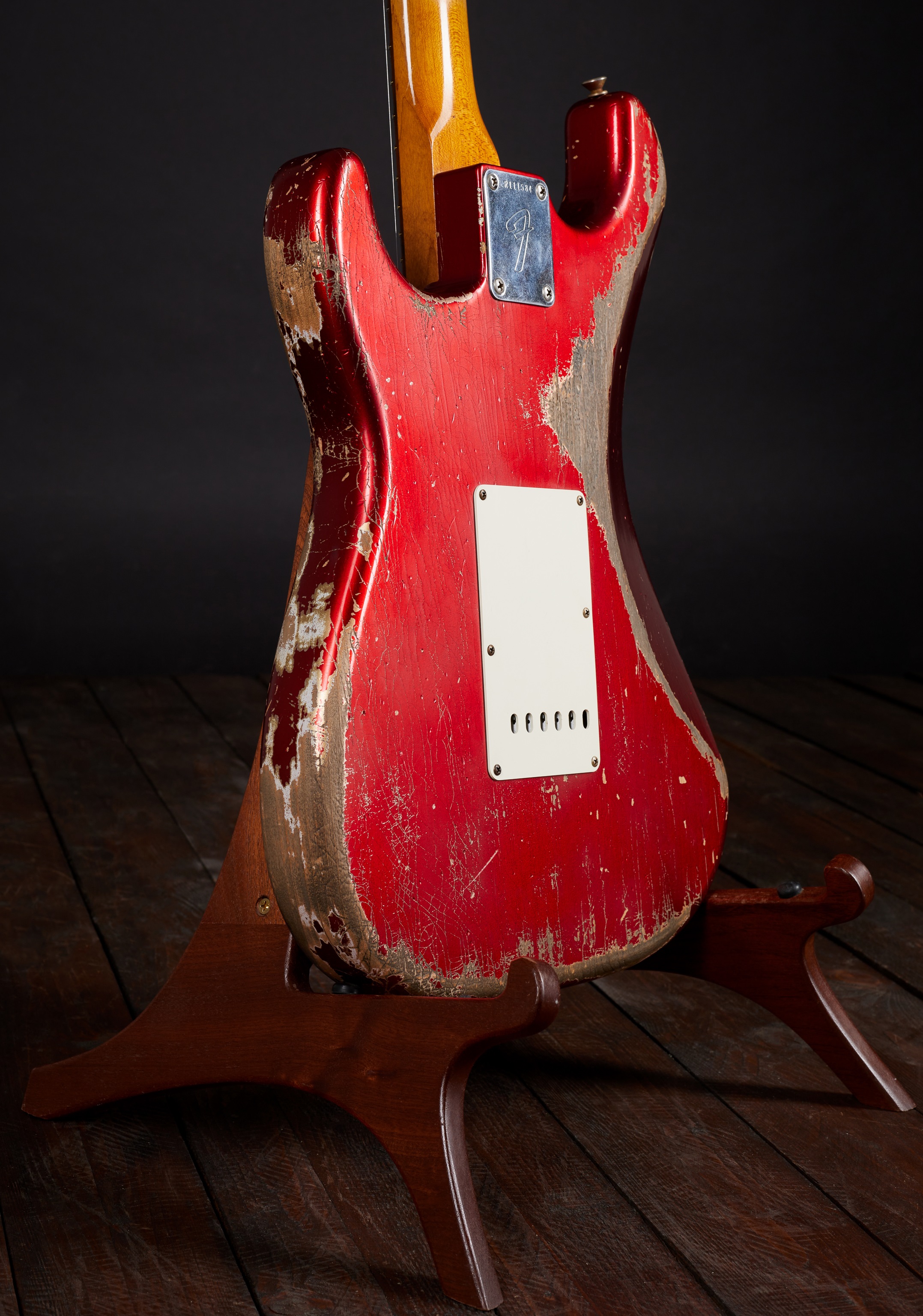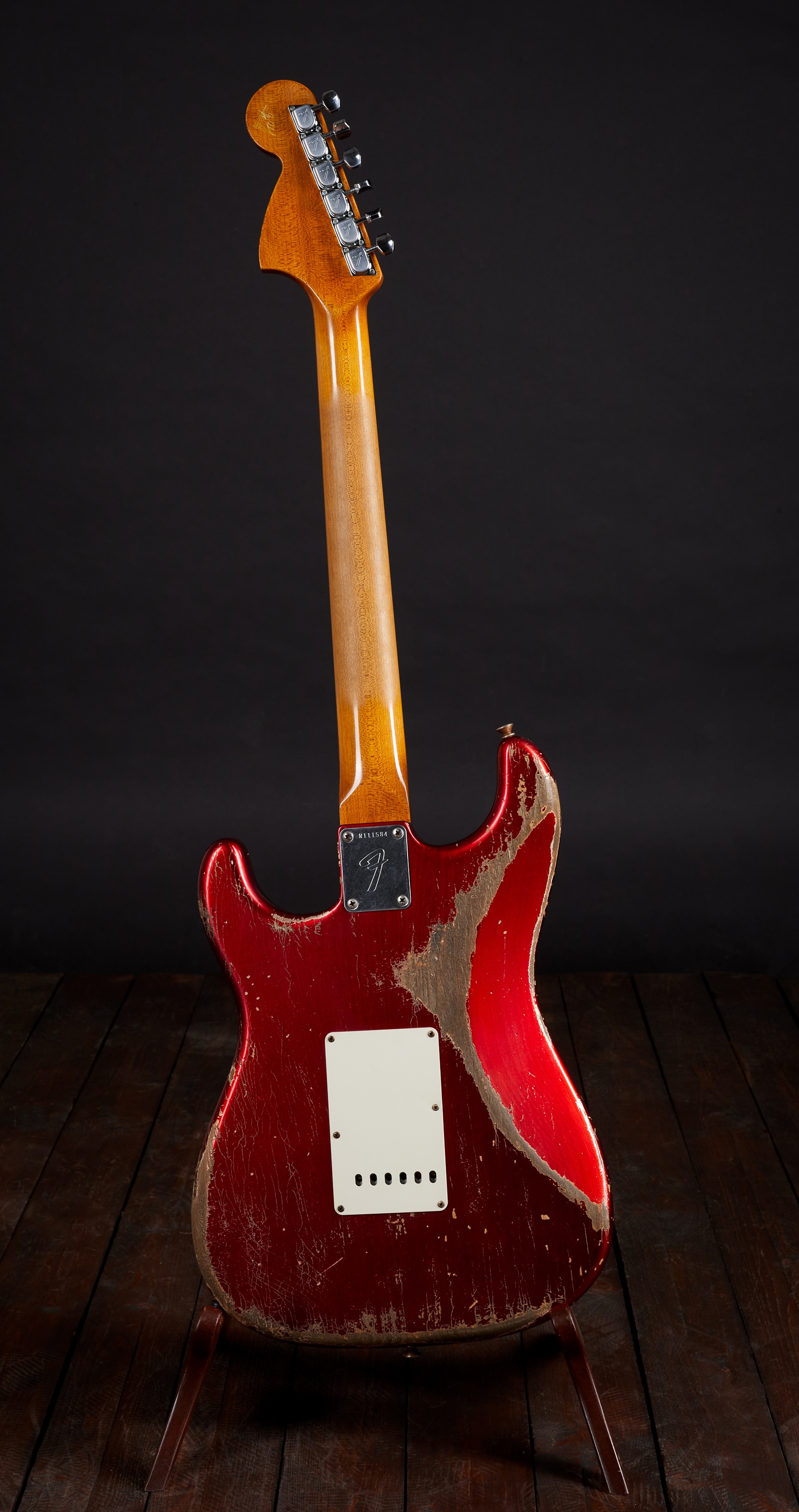 Elektrická gitara Tento skvost vytvoril v roku 2021 majster gitarového staviteľstva Greg Fessler, jeden z 12 majstrov, ktorí v súčasnosti stavajú gitary a basgitary vo Fender Custom Shop v Kalifornii. Základom tohto výnimočného stratocastera je telo z jelše Candy Apple Red a "roasted quartersawn" (t. j. zapečený a vyrezaný v najstabilnejšom pravidelnom reze) javorový krk s profilom "1969 U". Palisandrový hmatník má univerzálny rádius 9,5". Snímače sú, samozrejme, ručne vinuté Josefinou Campos v kategórii Ma