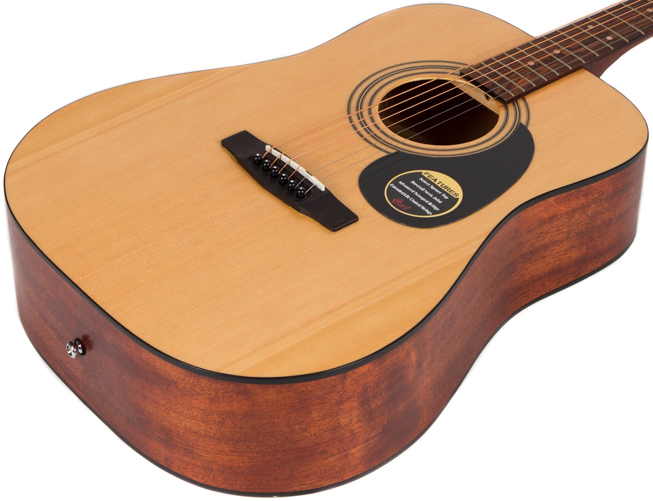 Akustická gitara Cort AD 810 je akustická gitara typu dreadnought. Vrstvené telo nástroja sa skladá zo smrekovej prednej dosky a mahagónovej zadnej dosky a lubov. Táto osvedčená kombinácia drevín dodáva nástroju vyvážený zvuk s potrebným množstvom tónovej čistoty a tepla. K mahagónovému krku je prilepený hmatník z exotického dreva merbau osadený dvadsiatimi pražcami s polohovacími bodmi, ktoré vám pomôžu orientovať sa na jeho povrchu. Uloženie strún v špeciálne tvarovanej hlavici z merbau a chrómových die-c