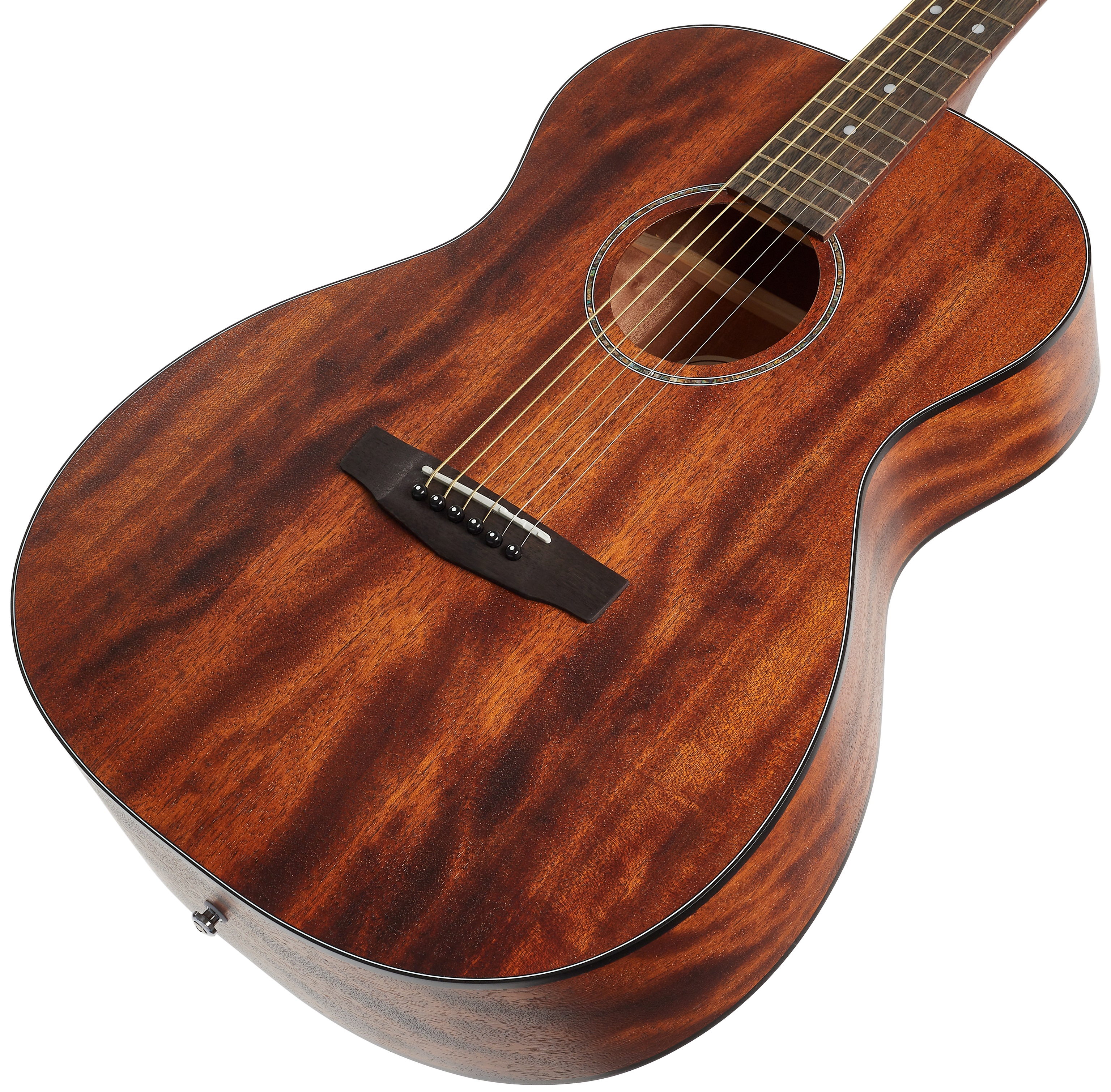 Akustická gitara Akustické gitary Cort zo série Luce sú alternatívou k populárnym modelom Dreadnought. Ide o nástroje s menším telom v tvaroch Orchestra, Concert a Parlor, ktoré ponúkajú skvelú hrateľnosť a vyvážený zvuk. Akustická gitara Cort L60 M OP s kompaktnejším telom Orchestra (OM) je vhodná na prstovú hru a hru trsátkom. Celomahagónová konštrukcia tela s masívnou rezonančnou doskou dodáva gitare nádherne teplý bohatý zvuk. Prirodzenú rezonanciu nástroja umocňuje rebrovanie Advanced-X na rezonančnej