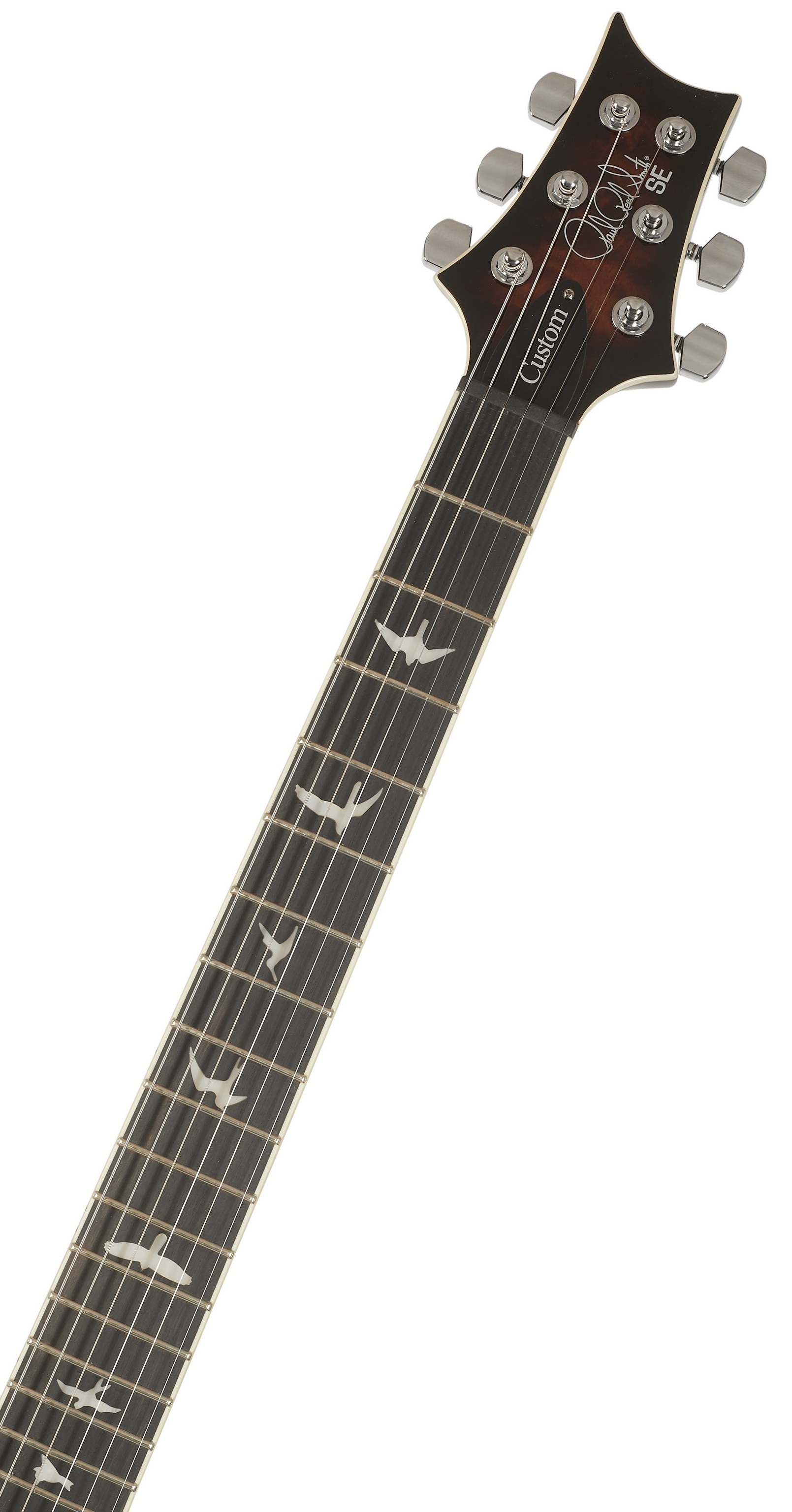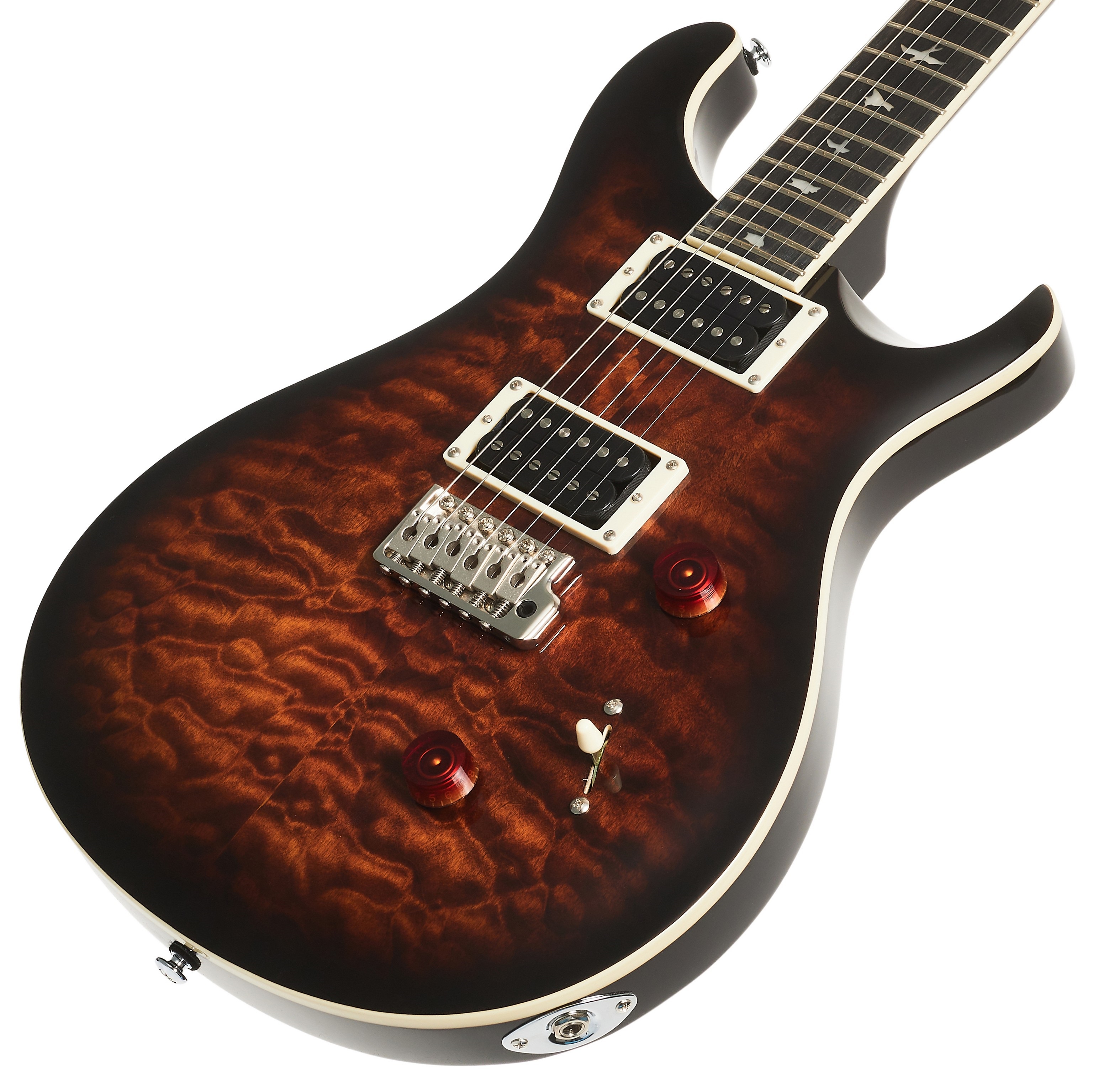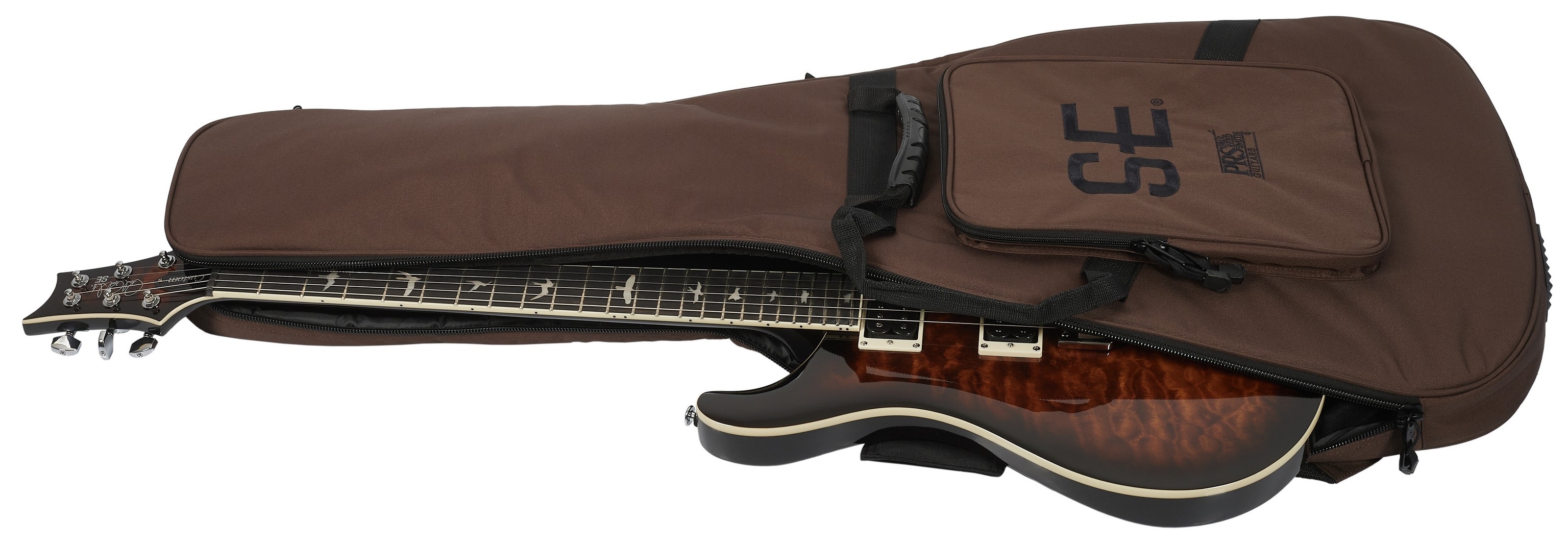 Elektrická gitara Elektrické gitary PRS SE Custom 24 z cenovo dostupnejšej série SE ponúkajú originálny dizajn tela PRS s dvoma výrezmi a kvalitu vyhotovenia zodpovedajúcu povesti značky. Mahagónové telo gitary SE Custom 24 Quilt Package Black Gold Sunburst zdobí javorová vrchná doska a efektná vrchná doska s plamennou javorovou dyhou, ktorá je použitá aj na hlavici. Vyrezávanie Shallow Violin približuje kvalitu hry nástroja k drahším modelom série American Core. Ebenový hmatník osadený dvadsiatimi štyrmi p