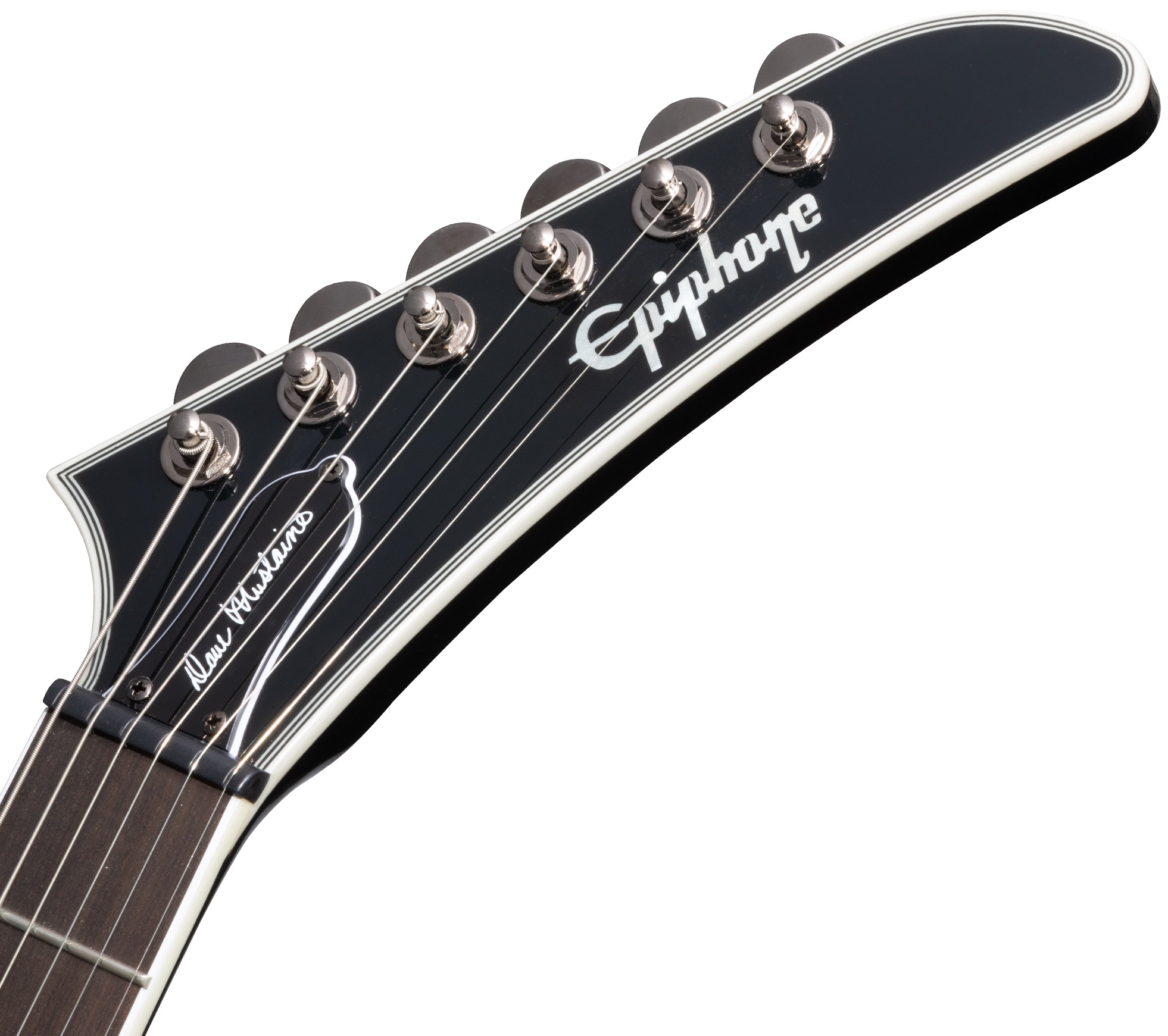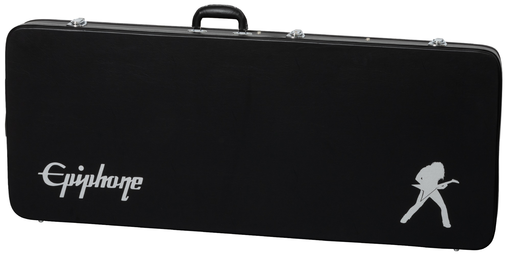 Elektrická gitara Elektrické gitary Epiphone sú už desaťročia cenovo dostupnejšou alternatívou originálov Gibson. Dave Mustaine Flying V Custom je signature modelom Davea Mustaina, frontmana slávnej americkej metalovej skupiny Megadeth. Mahagónové telo gitary zdobí čierna metalická farba. Mahagónový krk je prilepený k ebenovému hmatníku osadenému dvadsiatimi štyrmi Medium Jumbo pražcami. Orientáciu uľahčujú biele pozičné bodky na hmatníku. Dva pasívne humbuckery Seymour Duncan Thrash Factor Signature Dave M