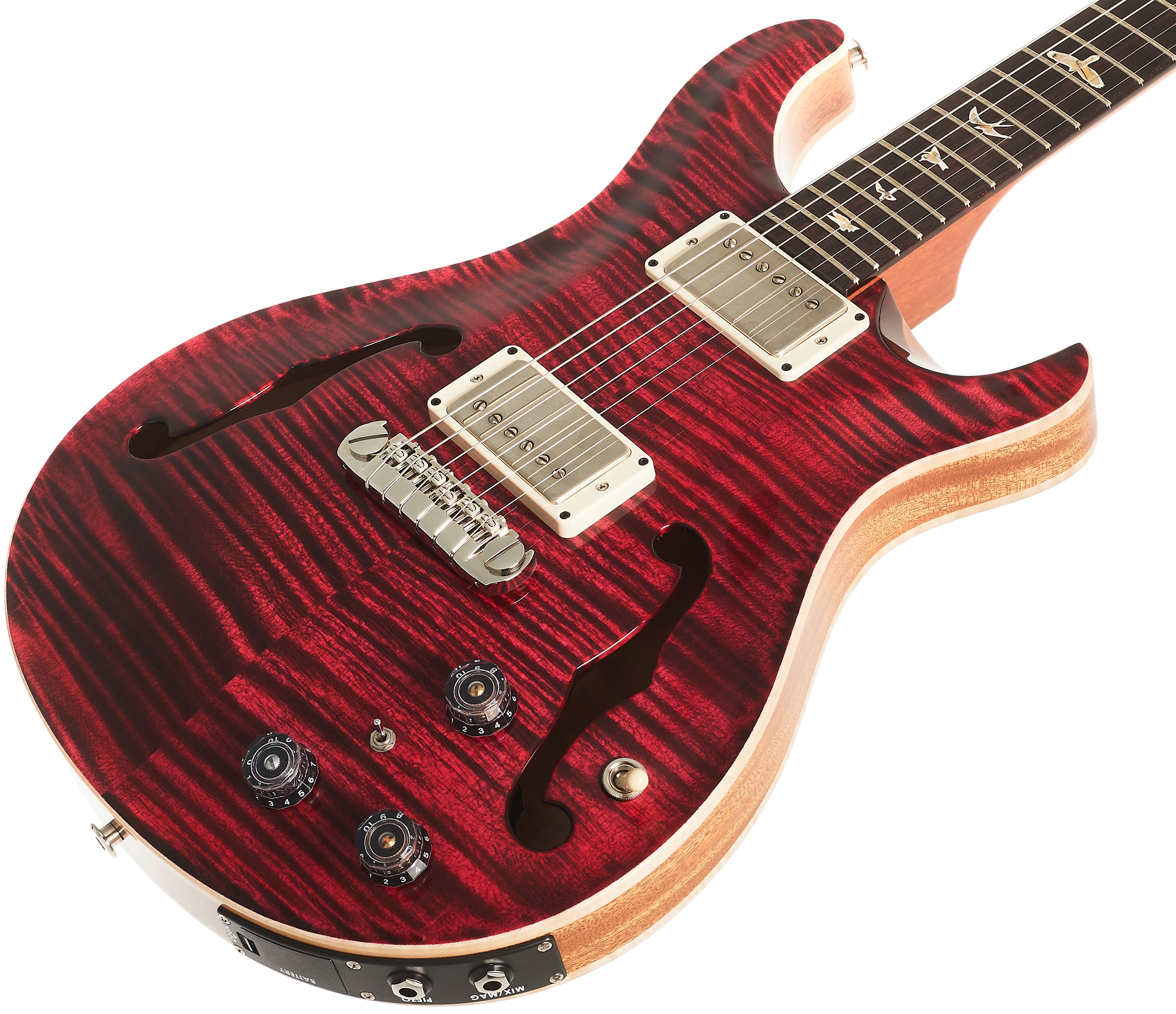 Semiakustická gitara Séria PRS Core spája elektrické gitary vyrobené v USA. Ide o jedny z najsofistikovanejších a najelegantnejších nástrojov, aké môžete v súčasnosti na trhu nájsť. Hollowbody II Piezo Red Tiger je gitara s rezonančným telom zloženým z javorovej prednej a zadnej strany a mahagónových lubov. Telo je pokryté lesklým nitrolakom. Jednodielny mahagónový krk s profilom Pattern je prilepený k palisandrovému hmatníku s dvadsiatimi dvoma pražcami. Orientáciu na hmatníku uľahčujú značkové PRS pozičné