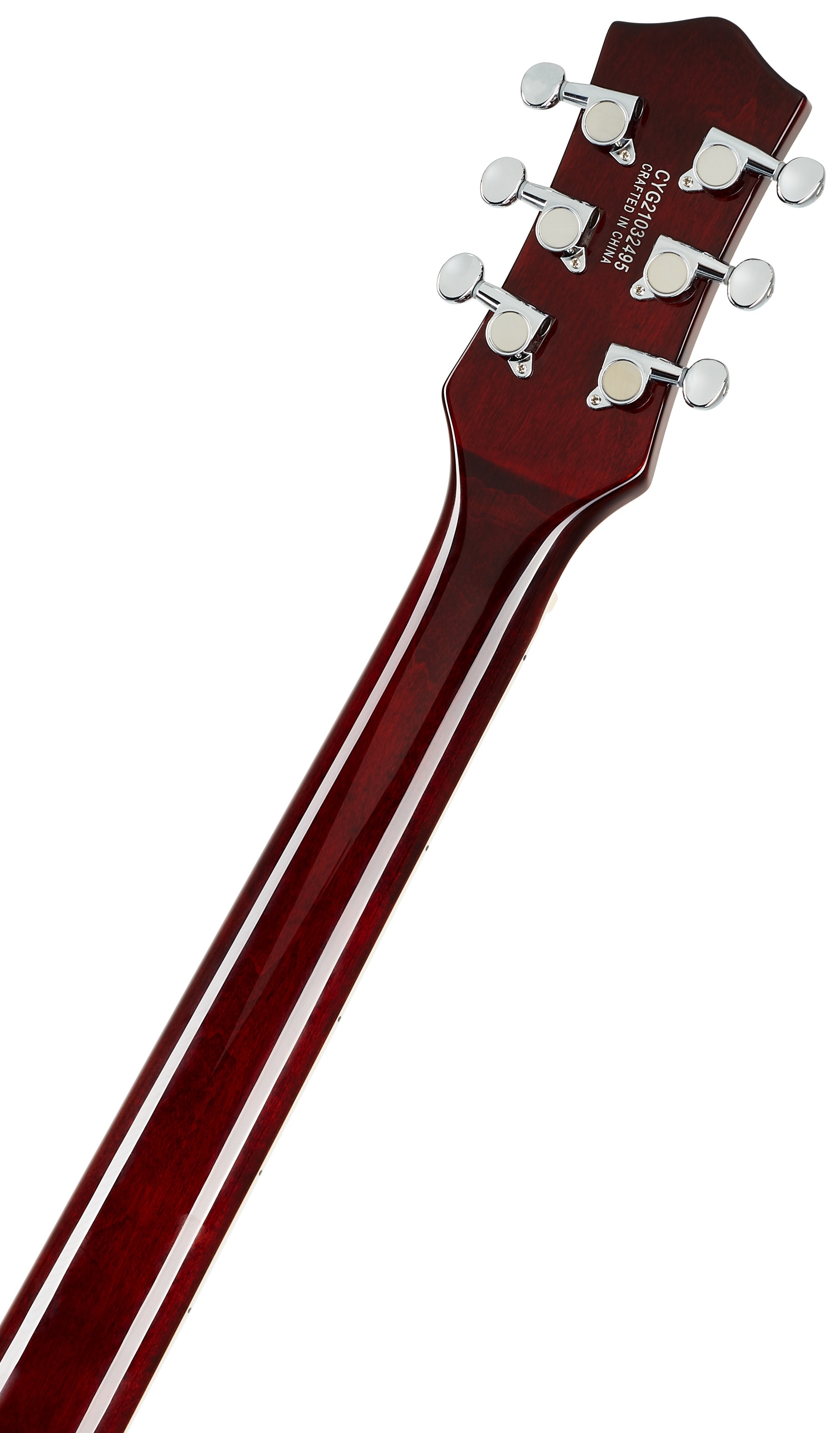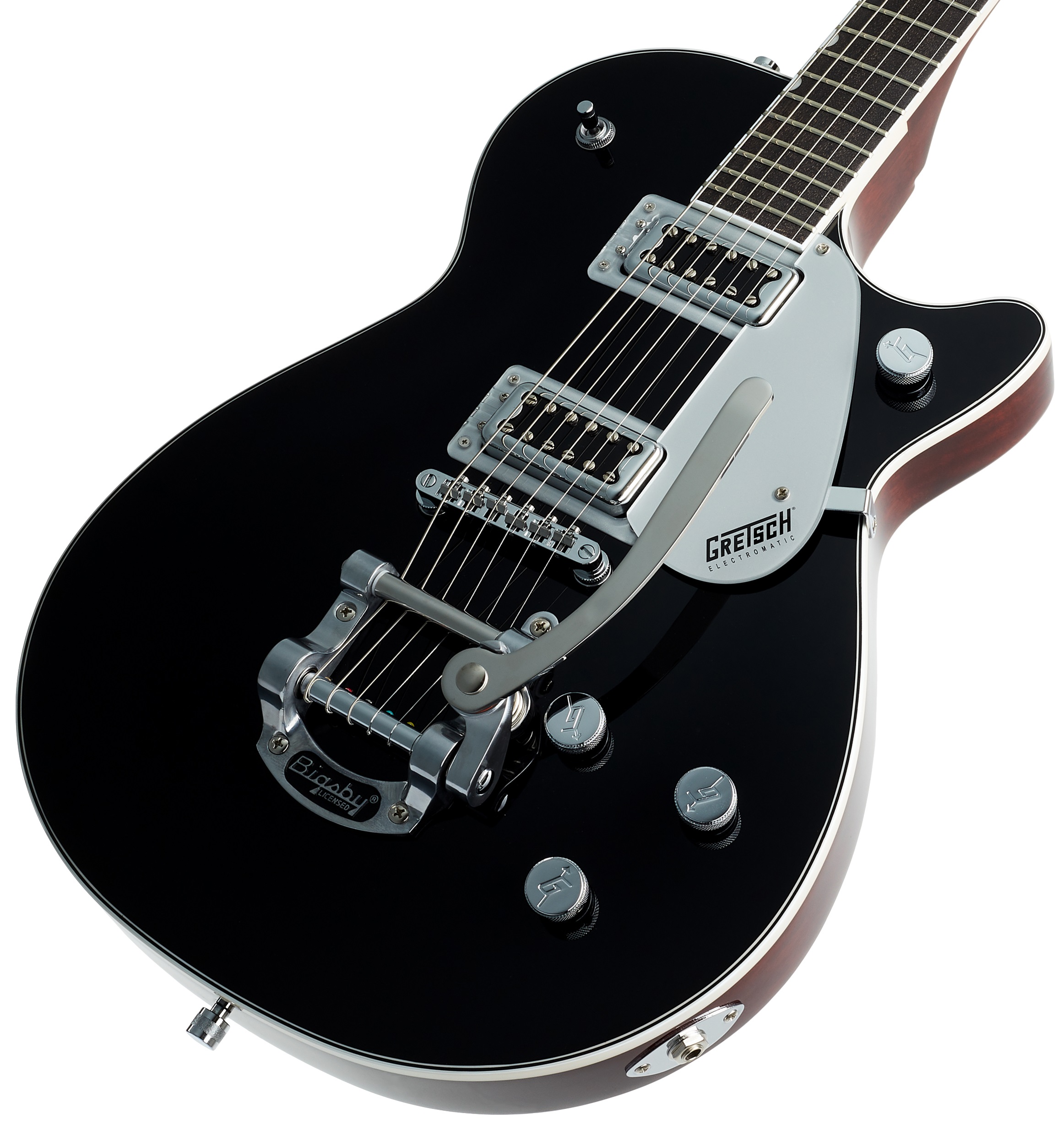 Elektrická gitara Elektrické gitary Jet, či už ide o modely zo základnej série Electromatic alebo vyššej série Professional, spája použitie masívneho tela s jedným alebo dvoma výrezmi. Ide o veľmi univerzálne nástroje, ktoré možno bez problémov použiť v širokej škále hudobných štýlov. Model G5230T patrí do vyššie uvedeného radu Electromatic. Jeho tvar vychádza z obľúbeného konceptu LP. Telo gitary je vyrobené z komorovaného mahagónu a vrchná doska z laminovaného javora, ktorý je obklopený bielym lemovaním s