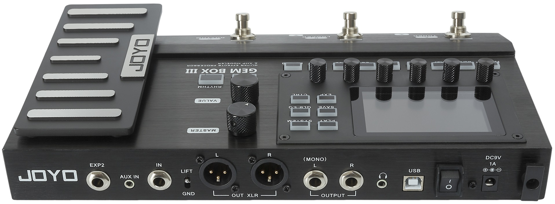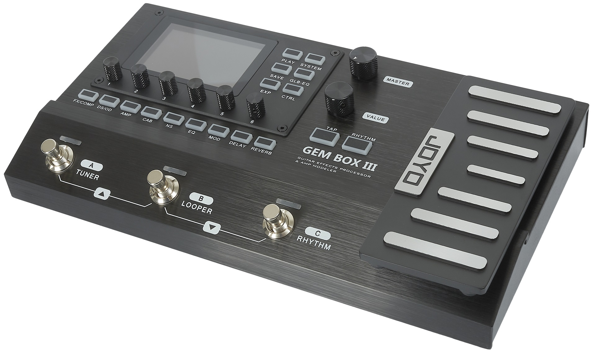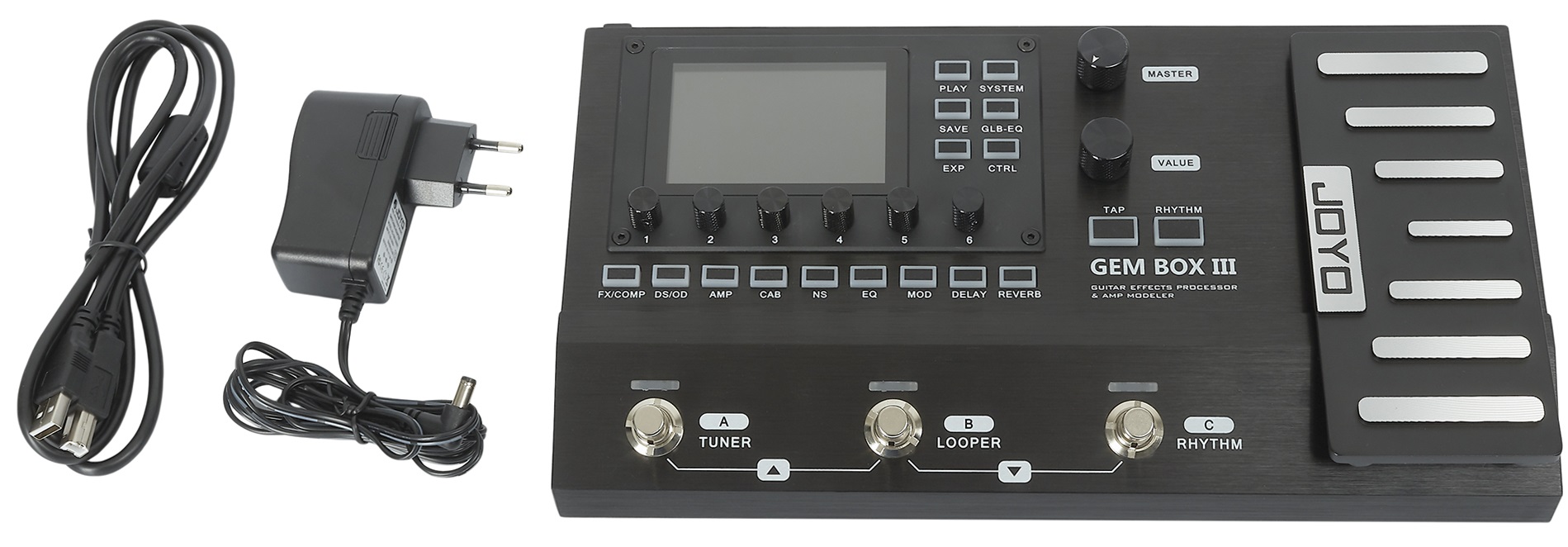 Gitarový multiefekt Gem Box III je najluxusnejší gitarový multiefekt od čínskej značky Joyo. Ponúka 157 digitálnych efektov (FX/Comp, Distortion/Overdrive, Noise Suppressor, EQ, Modulation, Delay, Reverb), 61 modulácií gitarových predzosilňovačov a 26 IR simulácií reproduktorov (vlastné IR je možné nahrať – 16/24/32bit, plná vzorkovacia frekvencia, formát WAV) a celkovo 300 firemných presetov v deviatich efektových podskupinách. Intuitívne používateľské rozhranie s prehľadným displejom umožňuje jednoducho u