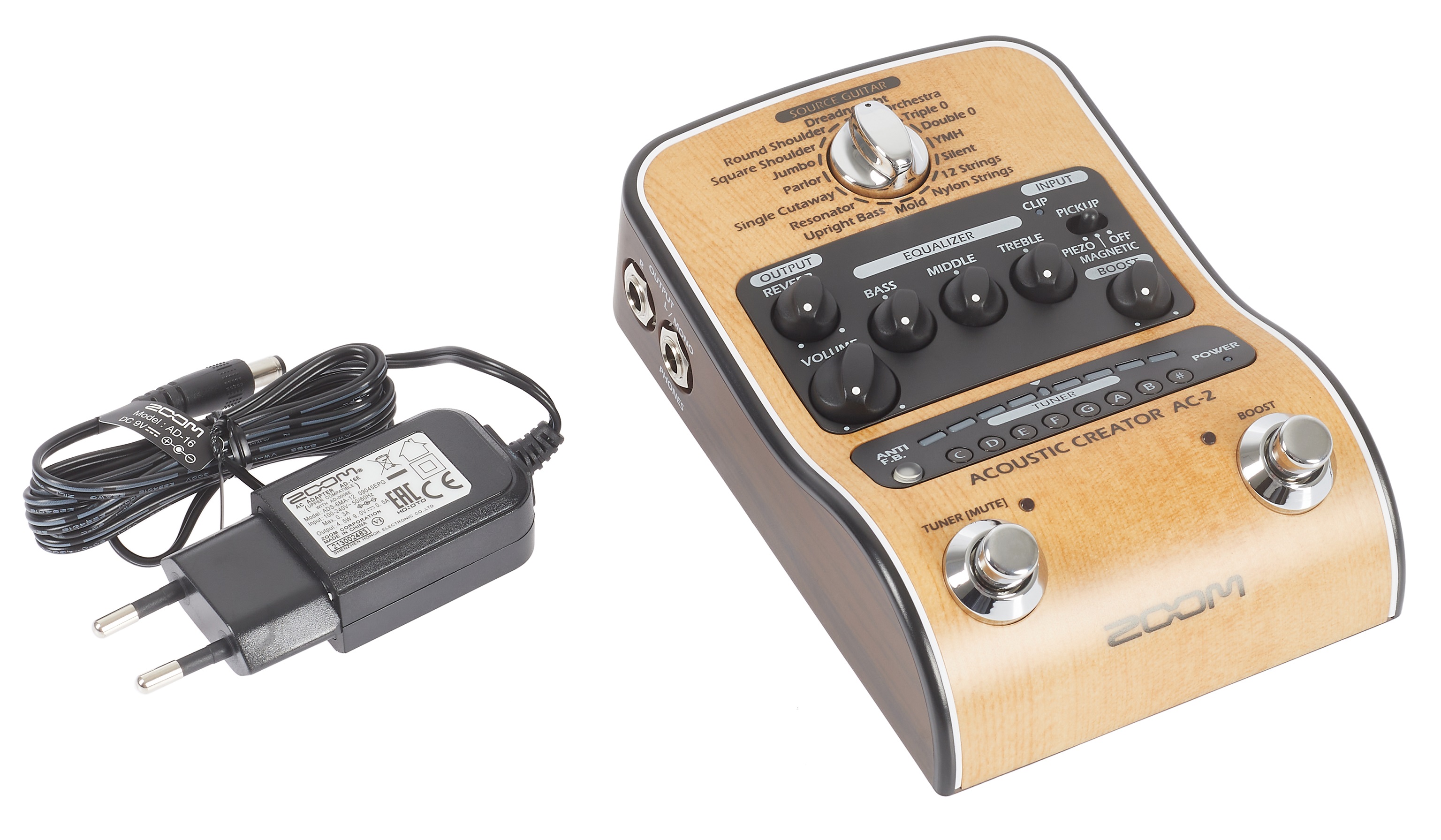 Gitarový multiefekt Zoom AC-2 je pedálový multiefekt/DI box pre akustické nástroje s piezo alebo magnetickými snímačmi. Používaním týchto zabudovaných snímačov gitary často strácajú svoj prirodzený, organický tón. Tento problém spoľahlivo vyrieši tento efektový/DI box. Je vybavený otočným ovládačom so šestnástimi typmi akustických gitár (vrátane dvanásťstrunových), ktoré si môžete vyvoliť, a trojpolohovým prepínačom snímačov (piezo/magnetické/vypnuté). Výsledný zvuk je podobný tomu, aký by ste získali s kva