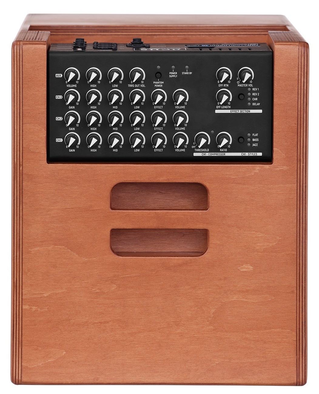 Kombo na akustické nástroje Acus One ForStrings 10 Ferdi Wood je trojkanálové akustické kombo zo série Ferdi s novým rozhraním/systémom Ferdi-UXLogic, výkonom 250 W a dvoma vstupmi (mikrofónovým a nástrojovým) na každom kanáli. Každý kanál má samostatný trojpásmový EQ, ovládanie hlasitosti, gain (-12 až +15 dB) a úroveň zvoleného vstavaného efektu. Prvý kanál navyše ponúka sekciu kompresora a trojpolohový prepínač, ktorý mení charakter EQ podľa zvoleného typu nástroja (Flat – lineárna odozva, rovnaký EQ ako