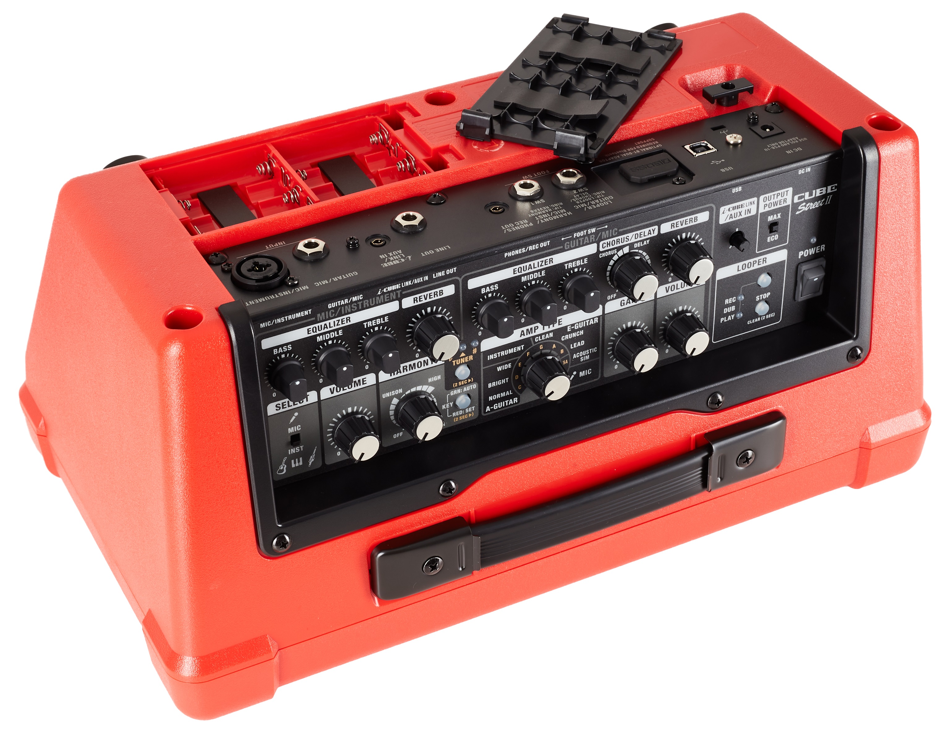 Gitarové modelingové kombo Boss Cube Street II je gitarové modelingové kombo určené pre pouličných umelcov/buskárov, skladateľov a všetkých hudobníkov, ktorí využijú ľahké prenosné kombo s batériovým napájaním (8x AA) a množstvom praktických funkcií vrátane kompatibility s Bluetooth na jednoduché ovládanie Cube Street II z telefónu. Toto dvojkanálové kombo vychádza z obľúbeného modelu Roland Cube Street a ponúka výkon 10 W a bohatý stereo zvuk z dvoch 6,5-palcových reproduktorov, pódiový sklon reproduktorov