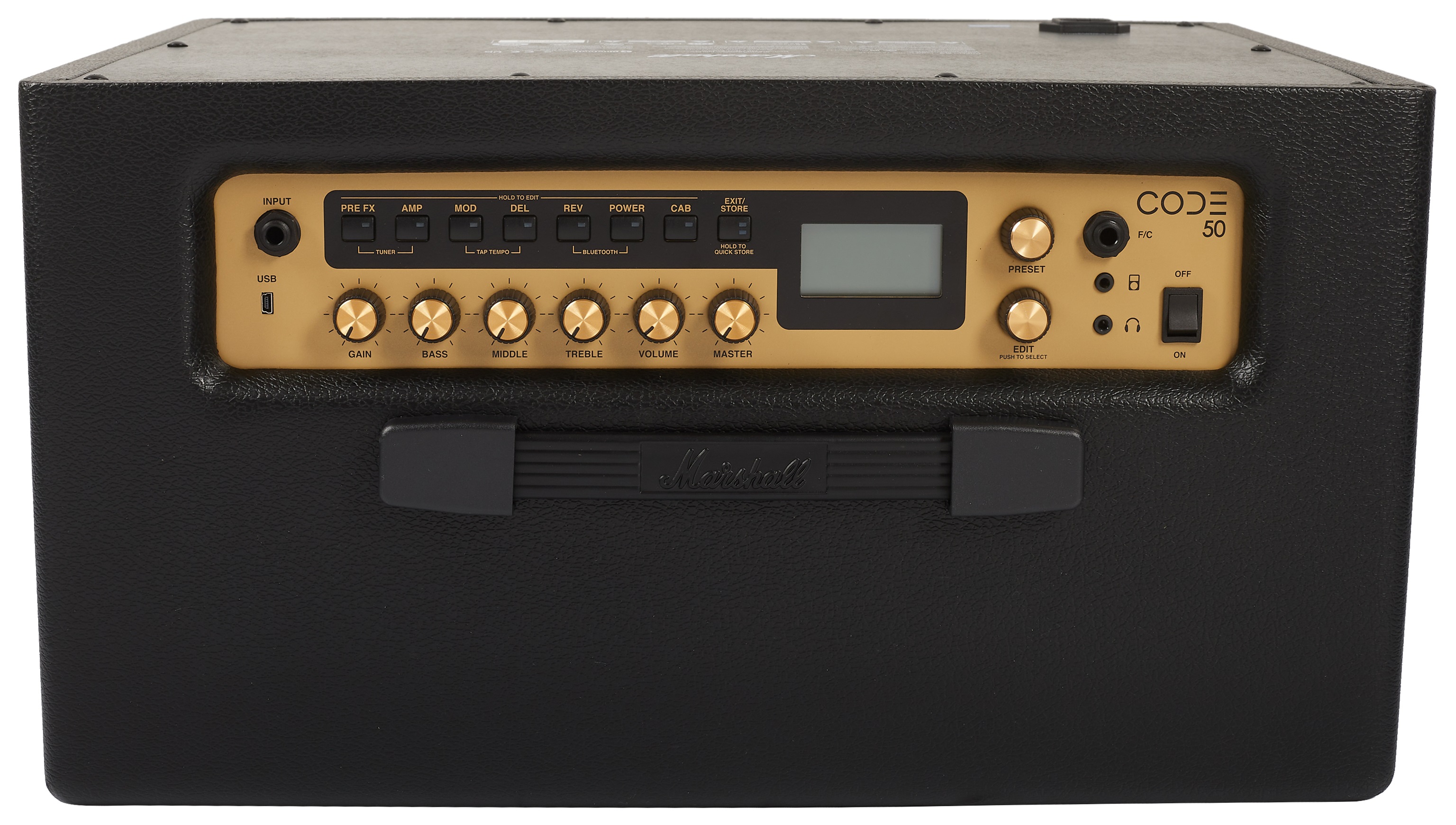 Gitarové modelingové kombo Modelingové kombá Marshall CODE ponúkajú prierez zvukovým charakterom nástrojov Marshall tak, ako sa menil v priebehu desaťročí s vývojom modernej populárnej hudby. Potreby dnešných gitaristov zvýrazňuje pripojenie Bluetooth a možnosť ovládať kombo a streamovať hudbu z mobilného zariadenia (iOS, Android) prostredníctvom aplikácie Gateway a konektora USB na pripojenie k DAW na počítači/notebooku/tablete. Model CODE50 ponúka výkon 50 W z 12-palcového reproduktora. Jednotlivé emuláci