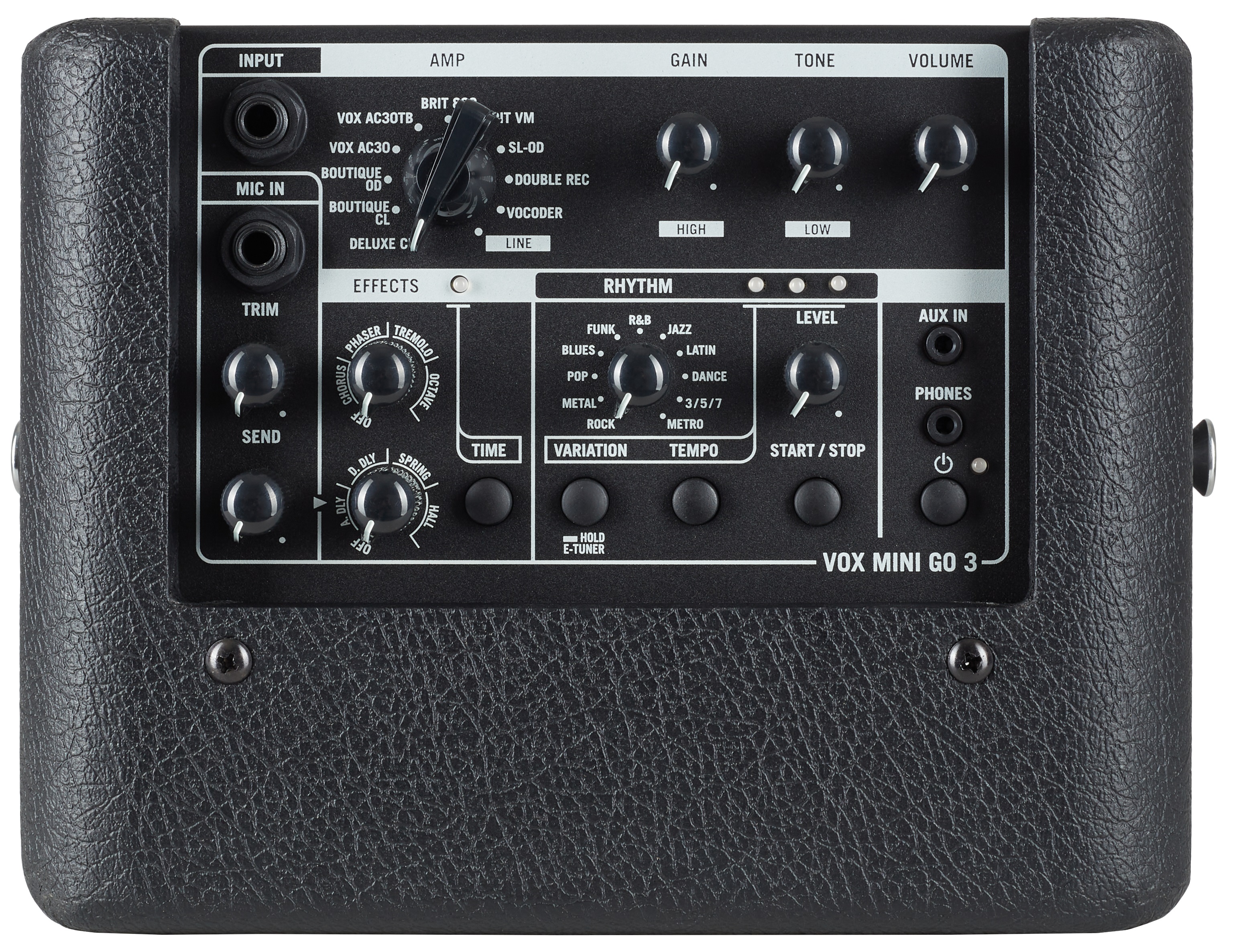 Gitarové modelingové kombo Rad Vox Mini Go ponúka gitarové modelingové kombá vhodné na domáce cvičenie, pouličnú produkciu a klubové vystúpenia. Vox Mini Go 3 je ľahké kompaktné kombo s jedenástimi gitarovými emuláciami (DELUXE CL, BOUTIQUE CL, BOUTIQUE OD, VOX AC30, VOX AC30TB, BRIT 800, BRIT VM, SL-OD, DOUBLE REC, VOCODER, LINE) prevzatý z Vox Vox Cambridge50 a vocoder modem pre talk mod efekty, osem vstavaných efektov (CHORUS, PHASER, TREMOLO, OCTAVE, ANALOG DELAY, DIGITAL DELAY, SPRING, HALL), Tridsaťtr