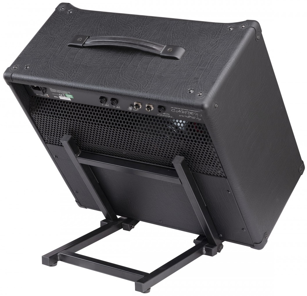Stojan na kombo Tento cenovo dostupný stojan je vhodný pre menšie gitary, basgitary a iné zariadenia, ktorým vďaka svojmu nakloneniu dozadu zabezpečí ideálnu zvukovú projekciu. Vďaka kompaktnej a skladnej konštrukcii je ideálny nielen do štúdia, ale aj do skúšobne alebo na pódium. Šírka základne pre kombo je 30 x 30 cm.
