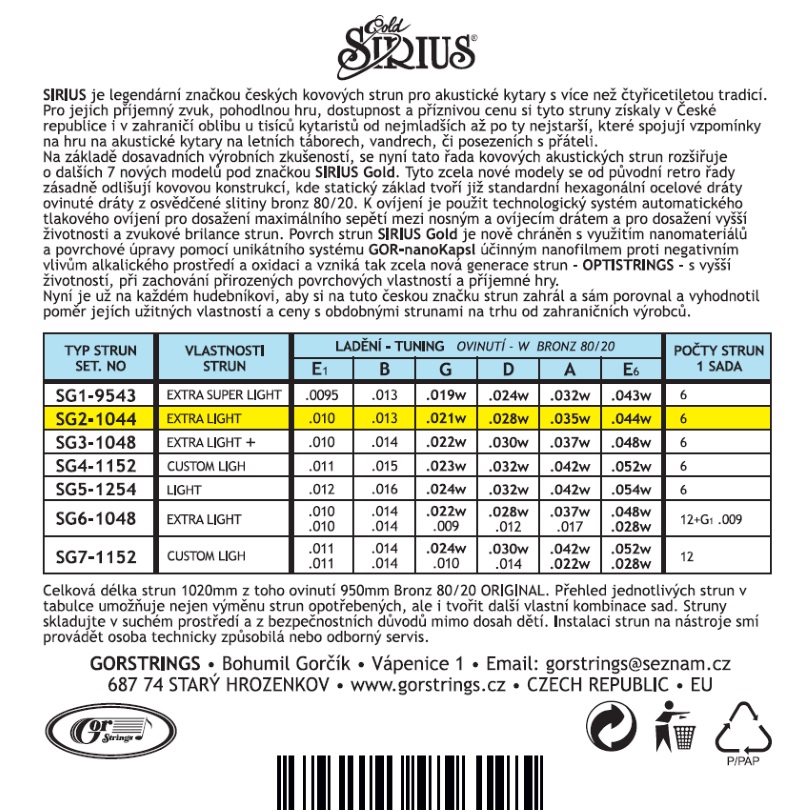 Kovové struny na akustickú gitaru Struny SIRIUS majú na českom trhu dlhoročnú tradíciu a sú veľmi obľúbené najmä medzi trampmi a folkármi. Ich veľkým lákadlom je nielen priaznivá cena, ale aj príjemný zvuk a pohodlné hranie. Táto nová séria Sirius Gold sa však od pôvodnej série Sirius líši hneď v niekoľkých ohľadoch. Struny majú šesťhranné jadro vinuté obľúbenou bronzovou zliatinou (80/20), vďaka čomu majú jasný, zvonivý zvuk, ktorý vynikne pri každom táboráku. Navyše sú potiahnuté špeciáln