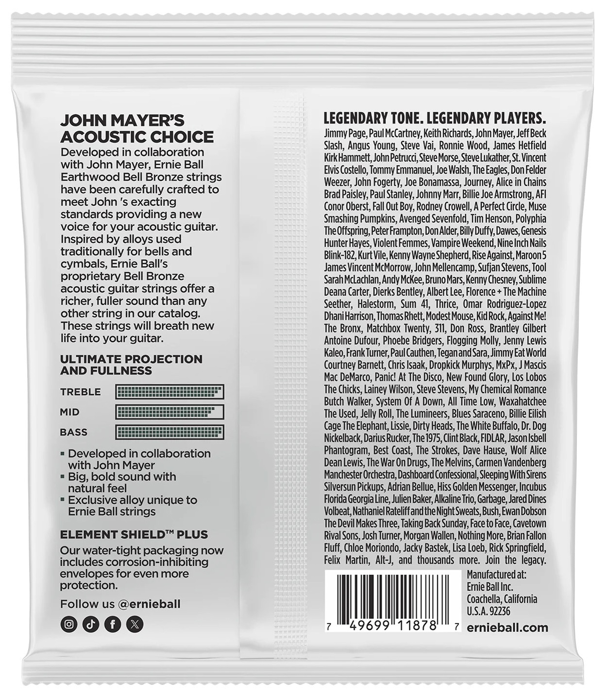 Kovové struny na akustickú gitaru Struny pre akustickú gitaru Earthwood Bell Bronze sú výsledkom dlhoročnej spolupráce spoločnosti Ernie Ball a gitaristu Johna Mayera, ktorého jedinečný štýl hry ovplyvnil celú generáciu hudobníkov. Táto sada bola vyladená tak, aby spĺňala Mayerove náročné požiadavky, a používa materiály, ktoré nenájdete v žiadnych iných strunách. Struny sú vinuté bronzovou zliatinou, ktorá sa tradične používa na zvončeky a činely, vďaka čom