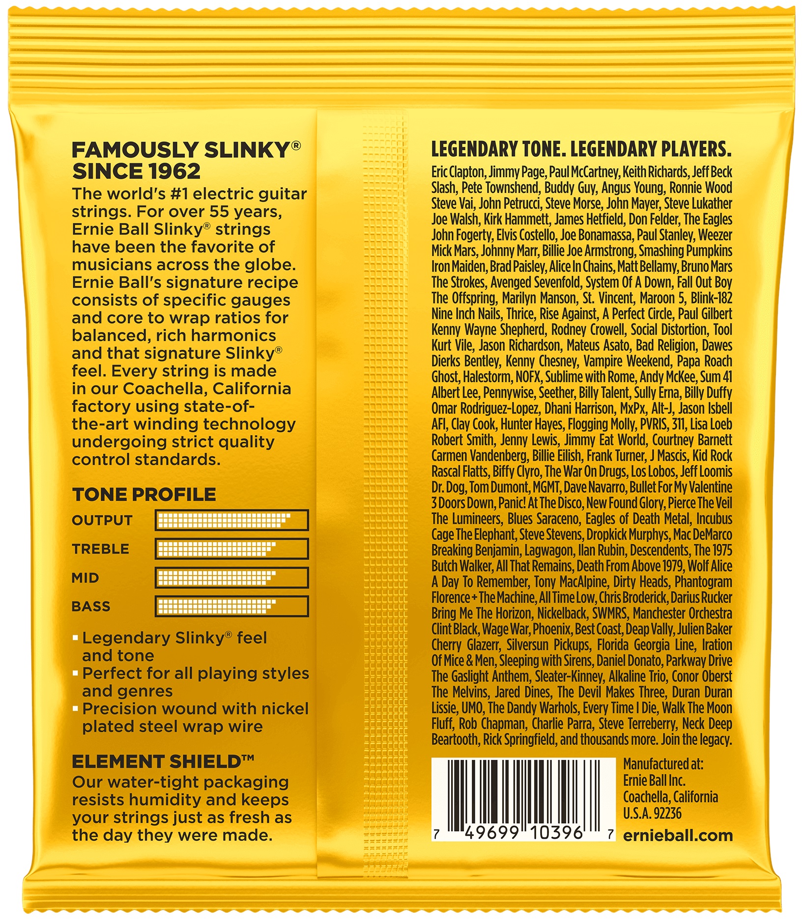 Struny na elektrickú gitaru Struny Ernie Ball Slinky Nickel Wound sú bestsellerom a zlatým štandardom medzi strunami na elektrickú gitaru. Vynikajú najmä kvalitou použitých materiálov, precíznym spracovaním a zvukovou univerzálnosťou, vďaka ktorej ich možno použiť takmer v každom hudobnom žánri. Ich základom je šesťhranné oceľové jadro a valcové vinutie z poniklovanej ocele. Výsledkom je frekvenčne vyvážený tón, ktorý možno použiť v rockovej, metalovej, popovej a bluesovej