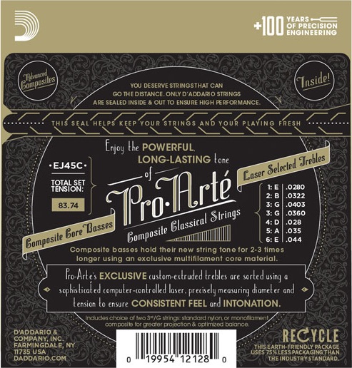 Nylonové struny na klasickú gitaru Nylonové struny D'Addario Pro-Arté EJ45C sú profesionálne struny na klasickú gitaru určené pre náročných hráčov. Táto sada obsahuje tri vysoké struny z číreho nylonu, ktoré produkujú teplý, zaoblený tón. K tomu tri basové struny, ktoré vďaka inovatívnemu kompozitnému jadru poskytujú silné, úderné basy. Výsledkom je vyvážená zmes hrejivého a asertívneho zvuku, ktorá vás zaujme a zároveň pohladí na duši. Vďaka strednému napätiu je táto sada