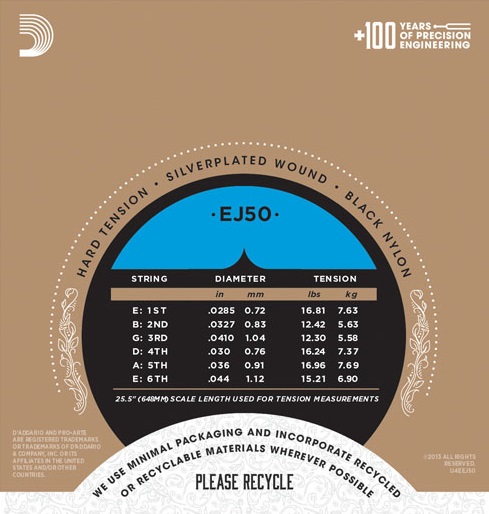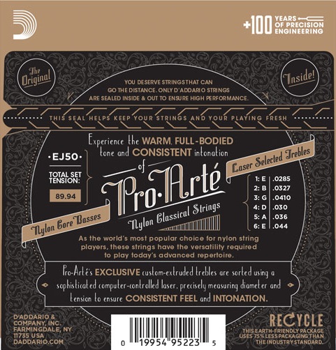 Nylonové struny na klasickú gitaru Nylonové struny D'Addario Pro-Arté sú profesionálne struny na klasickú gitaru určené pre náročných hráčov. Sada EJ50 obsahuje čierne nylonové struny, ktoré produkujú hladké a zaoblené výšky. Basové struny sú potiahnuté postriebrenou meďou, ktorá im dodáva výnimočne teplý zvuk. Vďaka vyššiemu napätiu (High Tension) sú struny úderné a poskytujú mohutný zvuk, ktorý vynikne na každom koncertnom pódiu. Ak hľadáte prvotriedny zvuk a presnú inton