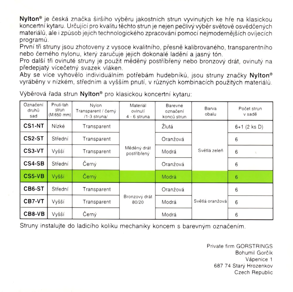 Nylonové struny na klasickú gitaru Nylonové struny pre klasickú gitaru zo série Nylton od českého výrobcu Gorstrings sú vyrobené z celosvetovo osvedčených materiálov s použitím najnovších technológií. Ich základom je kvalitné, presne kalibrované čierne nylonové jadro, ktoré je ovinuté obľúbenou postriebrenou meďou pre basové struny – vďaka tomu majú struny teplý, frekvenčne vyvážený zvuk, ktorý je ideálny pre domáce cvičenie, koncertné hranie a štúdiové nahrávanie. Struny b