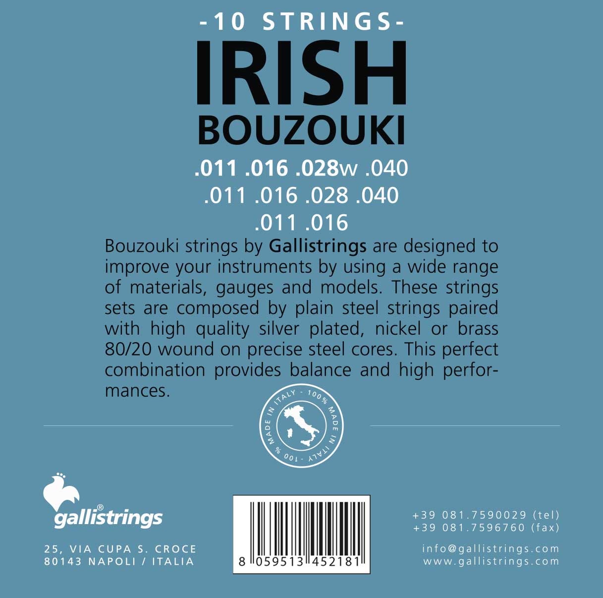 Struny na írske bouzouki Táto sada strún od talianskej spoločnosti Galli Strings bola špeciálne navrhnutá pre 10-strunové írske buzuki. Struny sú vyrobené z nehrdzavejúcej ocele a vinuté zliatinou fosforového bronzu. Výsledkom je teplý, frekvenčne vyvážený zvuk, ktorý znie skvele na pódiu, pri nahrávaní aj pri buskingu.