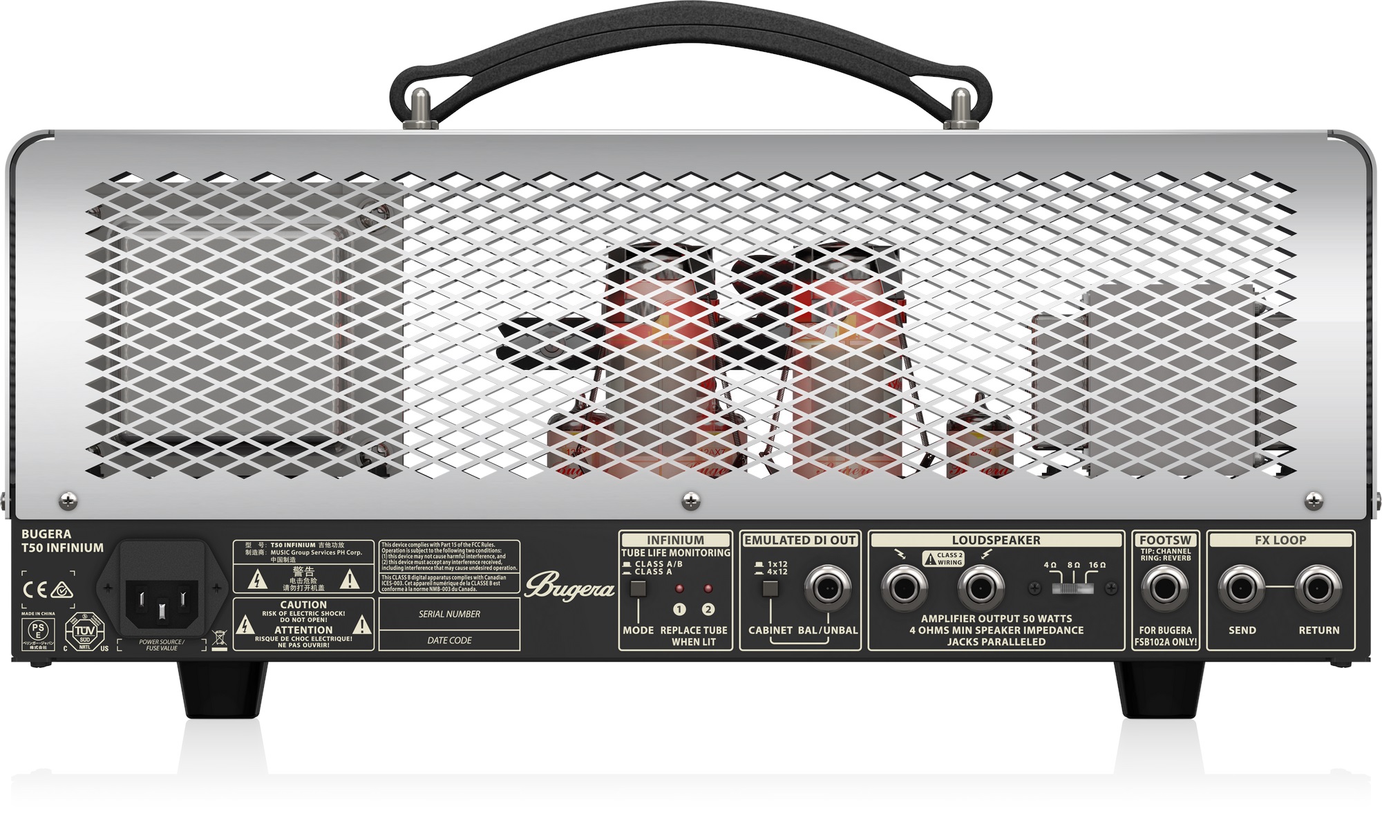 Gitarový lampový zosilňovač Bugera T50 INFINIUM je dvojkanálový lampový gitarový zosilňovač triedy A/AB s výkonom 50 W, ktorý oceníte v skúšobni, na pódiu aj v štúdiu. Charakteristika kanála Clean prechádza od čistého zvuku až po jemnú overdrive kresbu, kanál Lead pokračuje na škále od rockového overdrive až po agresívne metalové hi-gain skreslenie. Zosilňovač ponúka aj samostatné ovládanie kanálov (Gain, trojpásmový EQ), koncovú sekciu so zabudovaným efektom reverb, ovládanie Master Volume a Tone Cut (nast