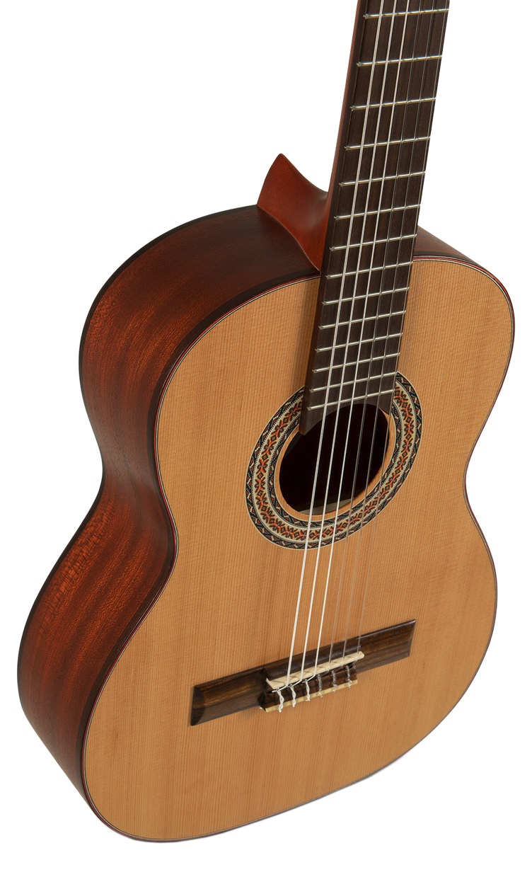 Detská klasická gitara Klasické gitary španielskej značky Manuel Rodriguez zo série TRADICÍON prinášajú v súlade s názvom série kombináciu tradičného dizajnu a časom overených drevín. Séria TRADICÍON T-53 1/2 size je detská klasická gitara vo veľkosti 1/2. Predná strana nástroja je vyrobená z masívneho červeného cédra, zatiaľ čo zadná strana a luby sú z laminovaného mahagónu. Gitara ďalej disponuje mahagónovým krkom, ovangkolovým hmatníkom a kobylkou, nultým pražcom a hmatníkovou intarziou zo syntetického b