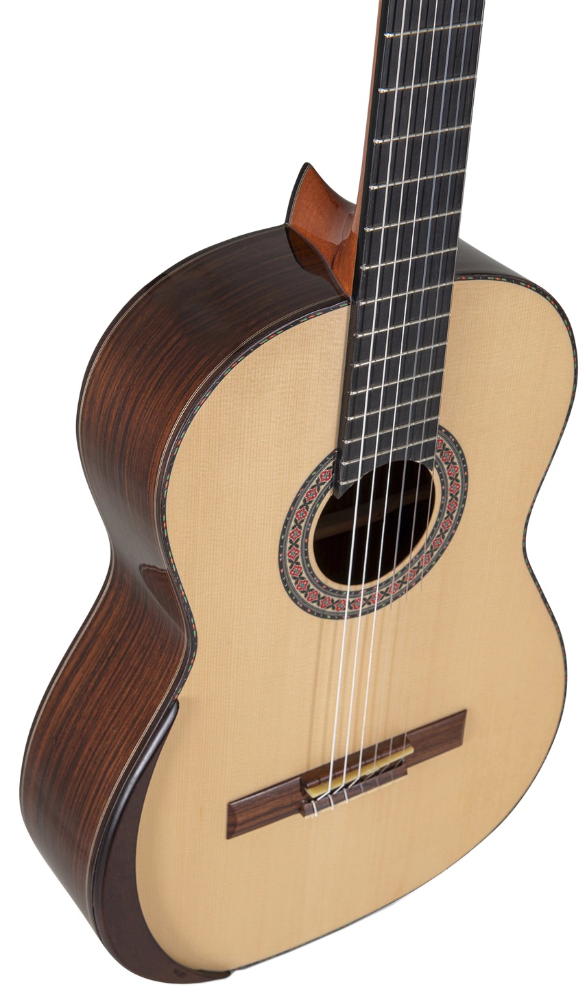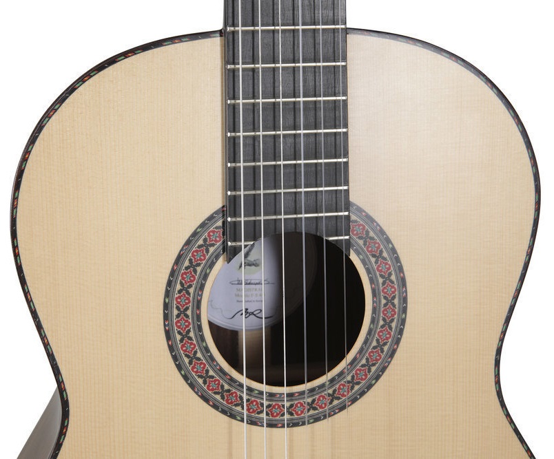 Klasická gitara Modelový rad MAGISTRAL od Manuela Rodrigueza ponúka celomasívne klasické gitary s masívnym spojom krku a tela "Spanish Heel", ľahkým cédrovým krkom s ebenovou výstuhou a kombináciou francúzskeho laku na vrchnej doske a lesklého laku na vodnej báze na zadnej strane a luboch. MAGISTRAL Series F ind. Rosewood all solid je klasická gitara v plnej 4/4 veľkosti. Predná doska je vyrobená zo smrekového dreva, zatiaľ čo zadná doska a luby sú z indického palisandru. Gitara je ďalej vybavená cédrovým k