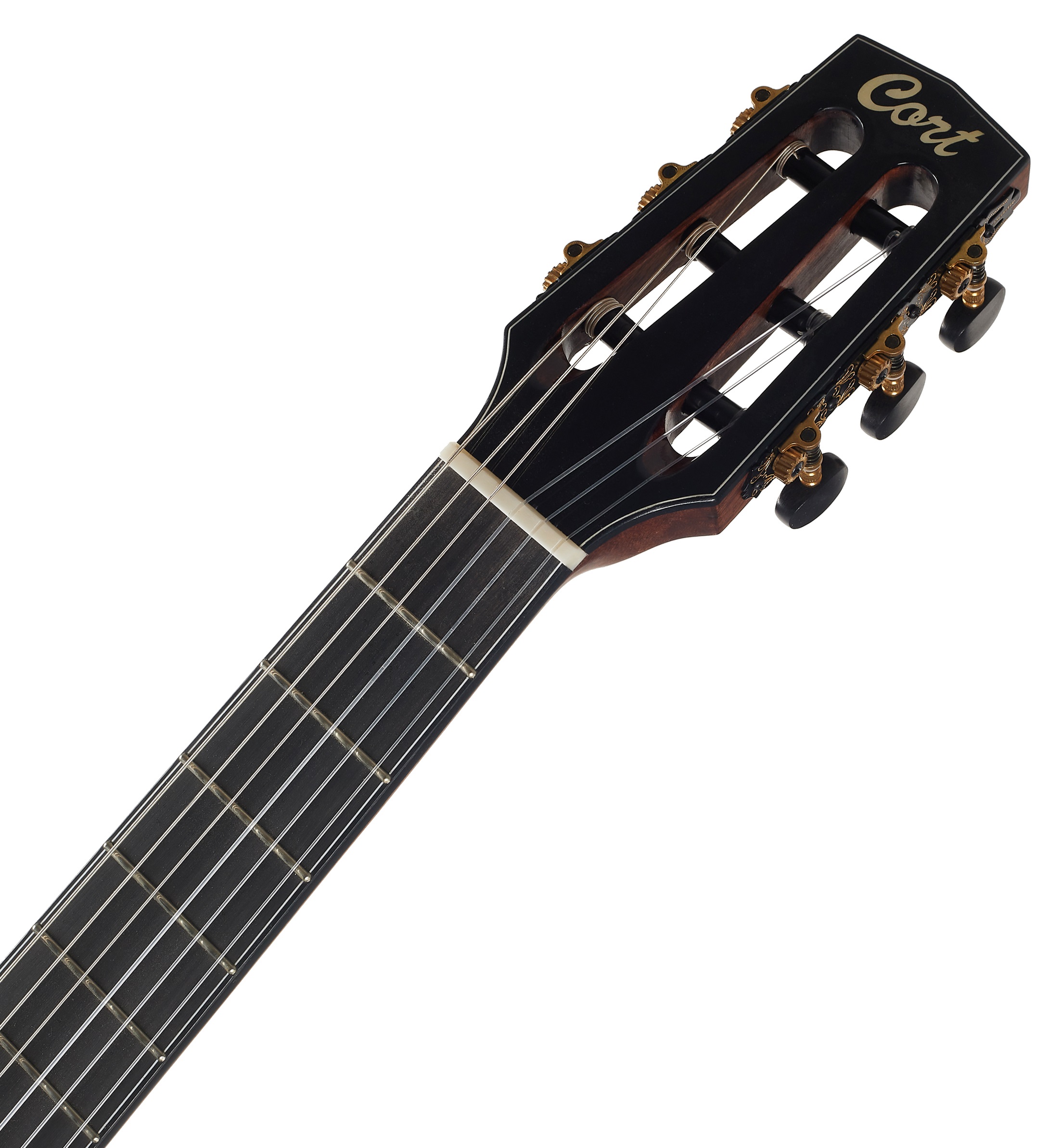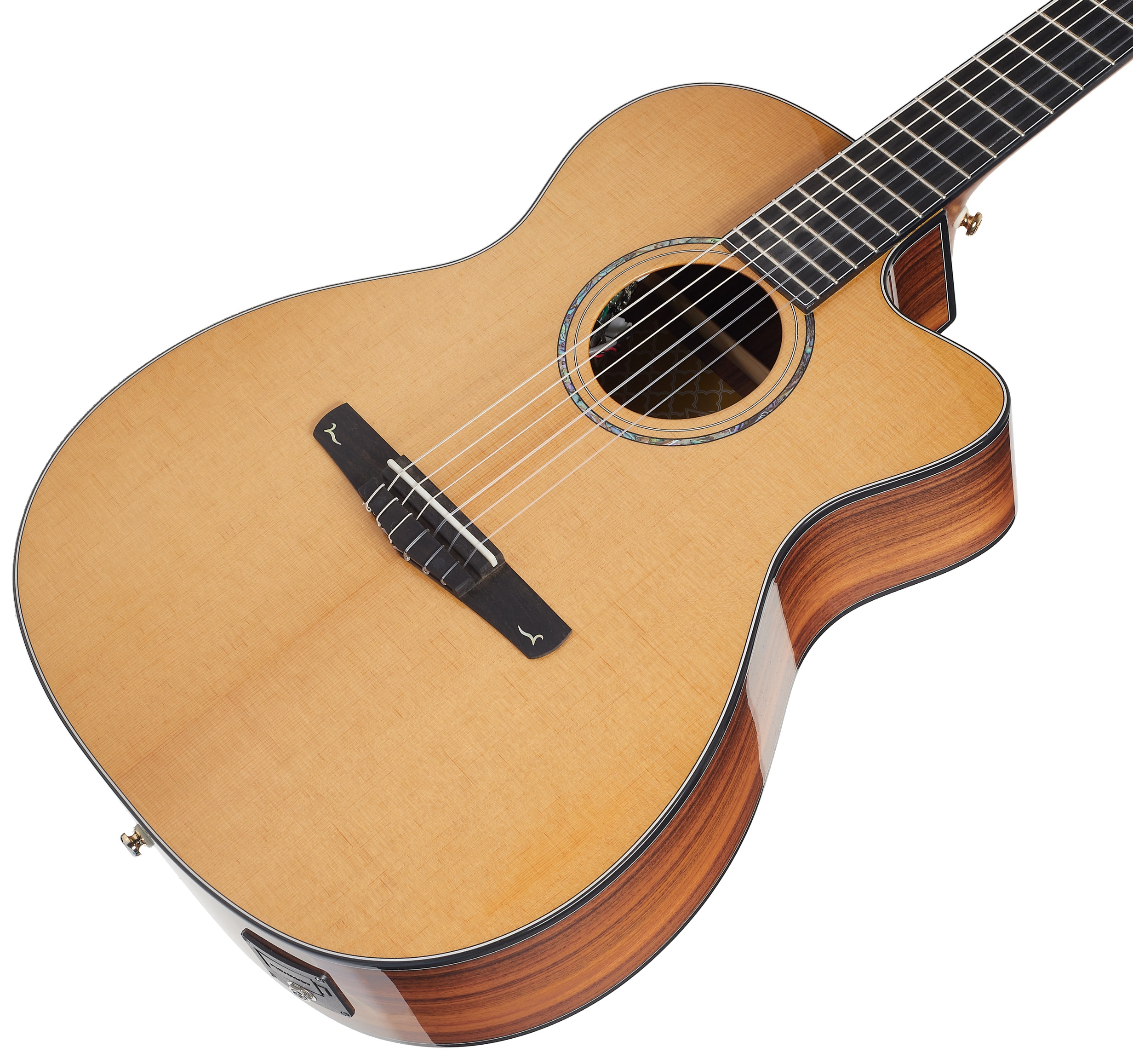 Klasická elektroakustická gitara Cort Gold-OC8 Nylon je prvá klasická gitara zo série Gold. Táto séria spája tie najlepšie nástroje z produkcie spoločnosti Cort, takže by nemala uniknúť pozornosti skutočných gitarových znalcov. Elektroakustická klasická gitara Gold-OC8 Nylon ponúka kompaktnejší tvar tela Orchestra (OM) a možnosť výberu systému aktívnej elektroniky Fishman Flex Blend s ovládaním hlasitosti, ekvalizérom, vstavanou ladičkou a funkciami Phase a Blend. Rezonančná doska gitary je vyrobená z masív