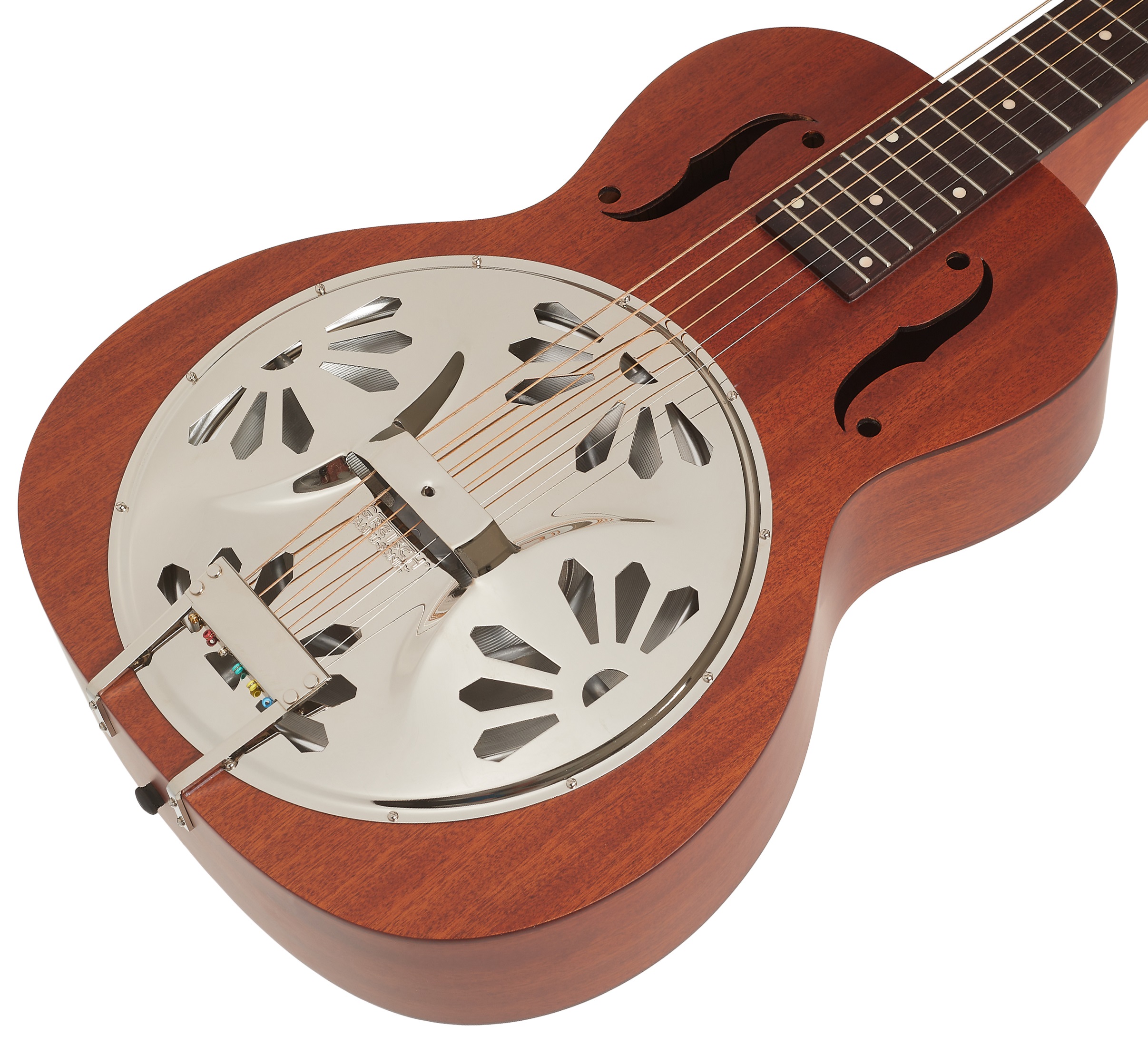 Akustický rezonátor Rezonátory Gretsch spájajú moderné výrobné postupy s tradičným zvukom a pocitom, ktorý vás spoľahlivo prenesie takmer o storočie späť v čase, do čias plných dymu a vzdialených železničných tratí. Telo modelu G9210 Boxcar je vyrobené z laminovaného mahagónu. Základný prvok všetkých rezonátorov Gretsch, samotný hliníkový rezonátor Ampli-Sonic, dodáva gitare pôsobivú kvalitu zvuku a hlasitosť. K mahagónovému krku s profilom Squareneck je prilepený hmatník z exotického dreva padauk osadený d