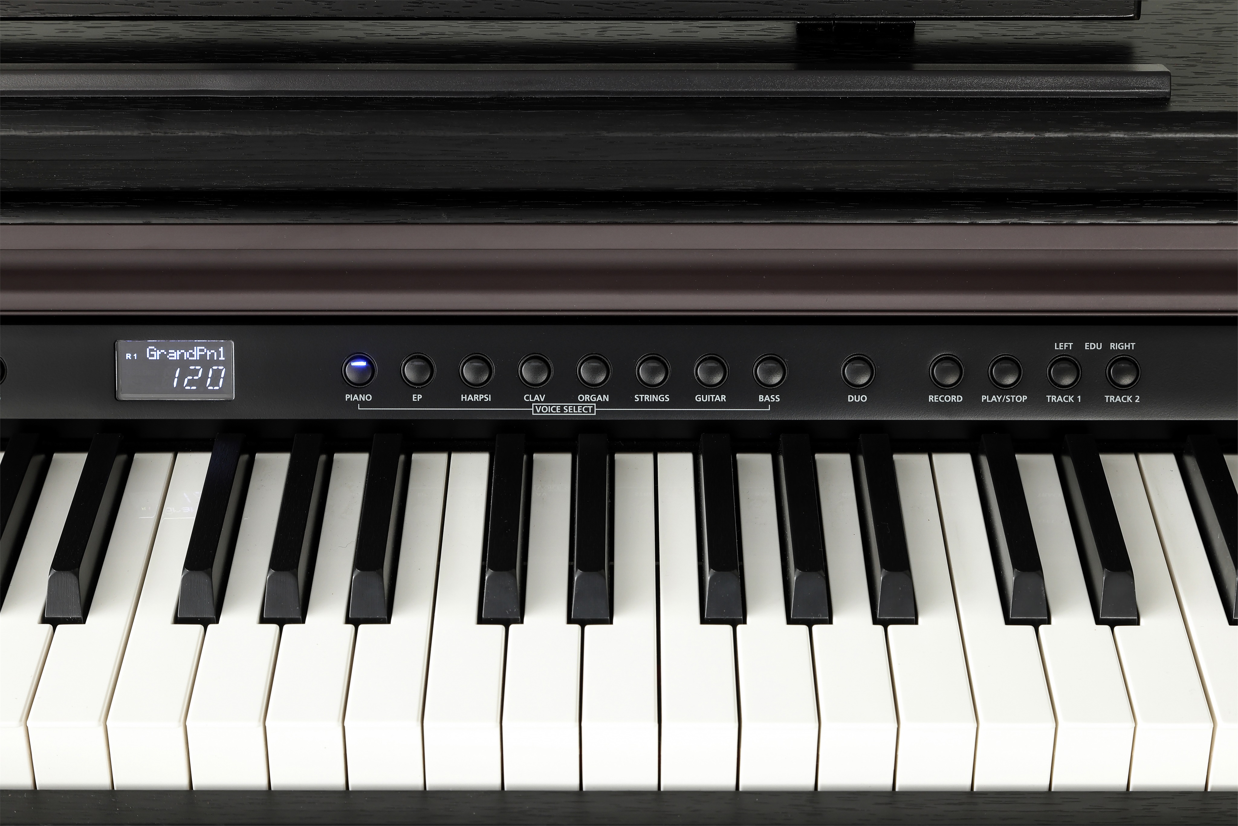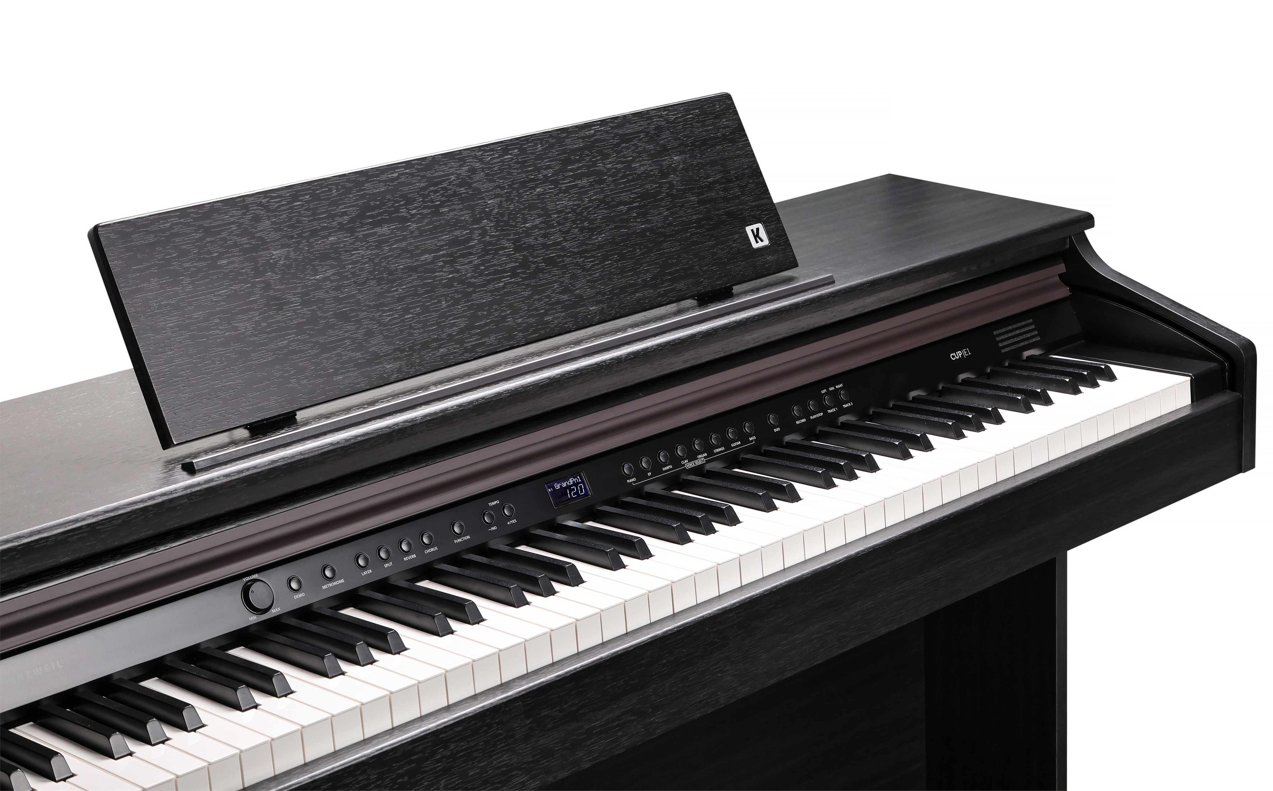 Digitálne piano Kurzweil CUP | E1 je domáce digitálne piano s klaviatúrou H1 Ivory, 88 klávesmi plnej veľkosti a pevným dreveným stojanom. Zlepšite svoj zážitok z hrania s klaviatúrou Kurzweil s mechanikou H1 Ivory pre úplne prirodzený zvuk. Precízne vyrobené čierne klávesy kopírujú textúru dreva, zatiaľ čo biele klávesy majú vrchné časti vo farbe slonoviny, ktoré verne reprodukujú nuansy a autentický pocit z hry na akustickom klavíri. CUP | E1 je vybavený 128 MB zv