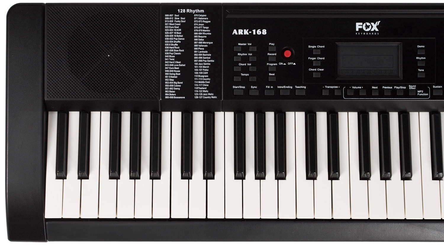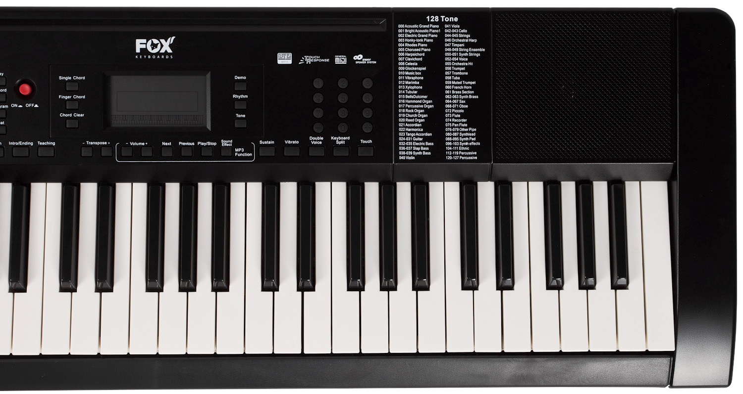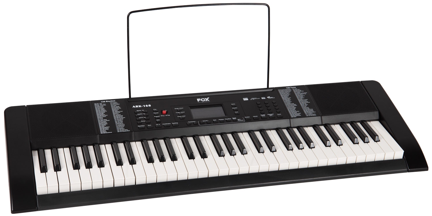 Klávesy s dynamikou úderu Klávesové nástroje FOX sú obľúbené pre svoj bezkonkurenčný pomer cena/výkon a sú vhodné najmä pre začínajúcich a detských hudobníkov. Budú im ponúknuté všetky základné funkcie, ktoré im pomôžu naučiť sa základné princípy hudby a spoznať rôzne farby zvuku. A ak sa hudobná vášeň nakoniec nerozvinie, nemusíte smútiť nad tým, že ste do svojho prvého nástroja investovali neprimerane vysokú sumu. FOX 168 ponúka 61 klávesov štandardnej veľkosti s dynamikou, 128 zvukov a 128 automatických
