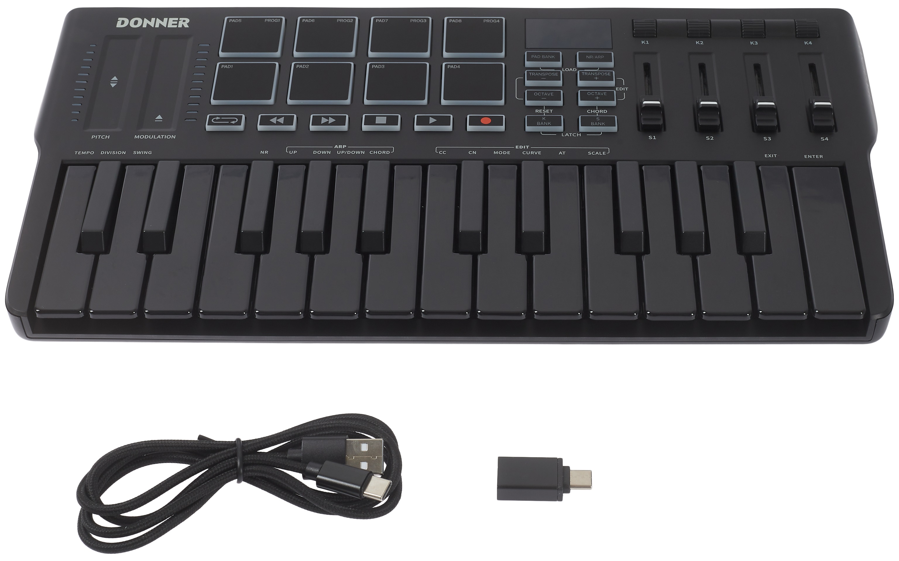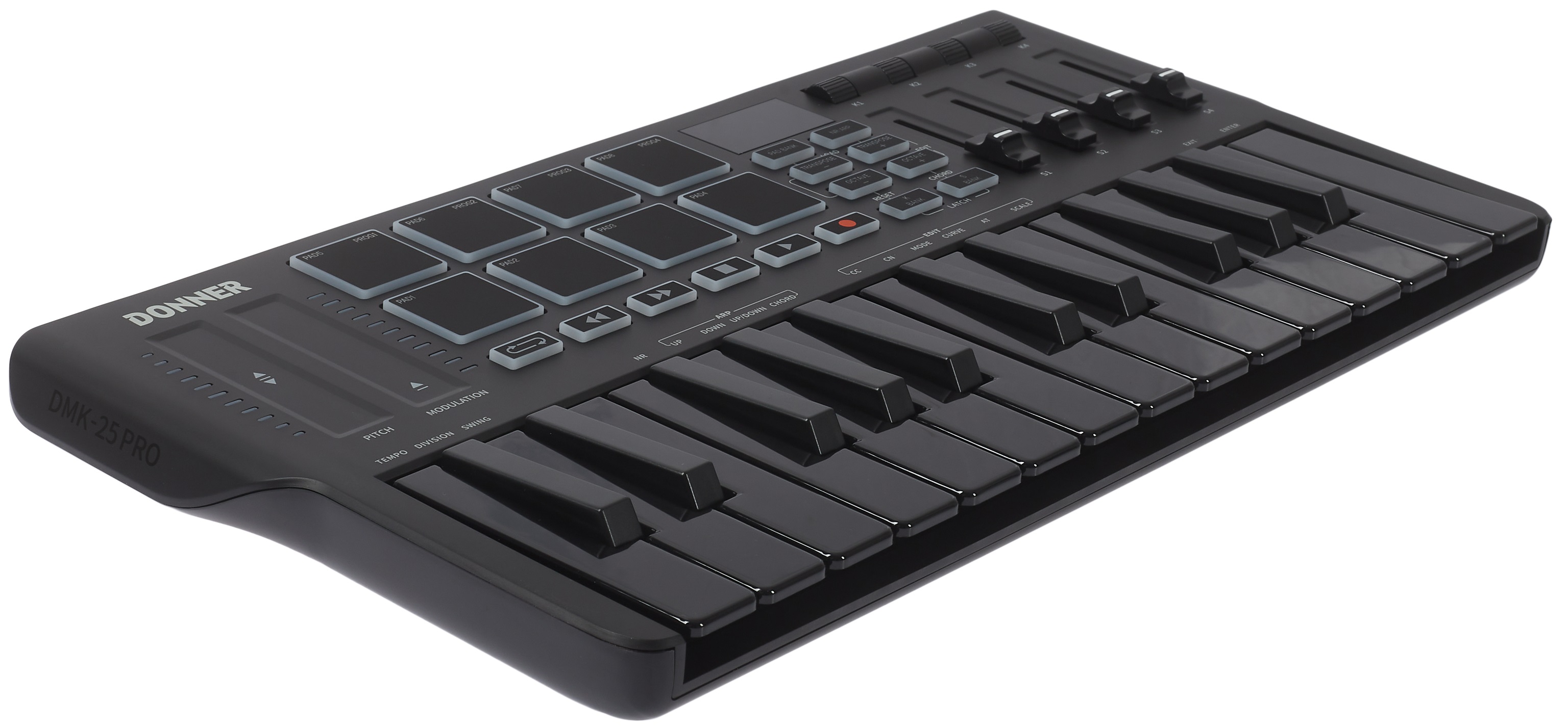 USB/MIDI keyboard Donner DMK-25 je kompaktný MIDI keyboard s 25 klávesmi, ktorý otvára cestu k hudobnej tvorbe profesionálnej kvality a zároveň zostáva prístupný aj pre začiatočníkov. Vďaka inteligentnému režimu Dynamic Scale Mode možno ľahko hrať basové linky, melódie a akordy – k dispozícii je 16 ladení pre rôzne hudobné žánre. Pre ešte väčšiu flexibilitu vám funkcie arpeggiator, opakovanie nôt a akordov umožnia rýchlo rozvíjať hudobné ná