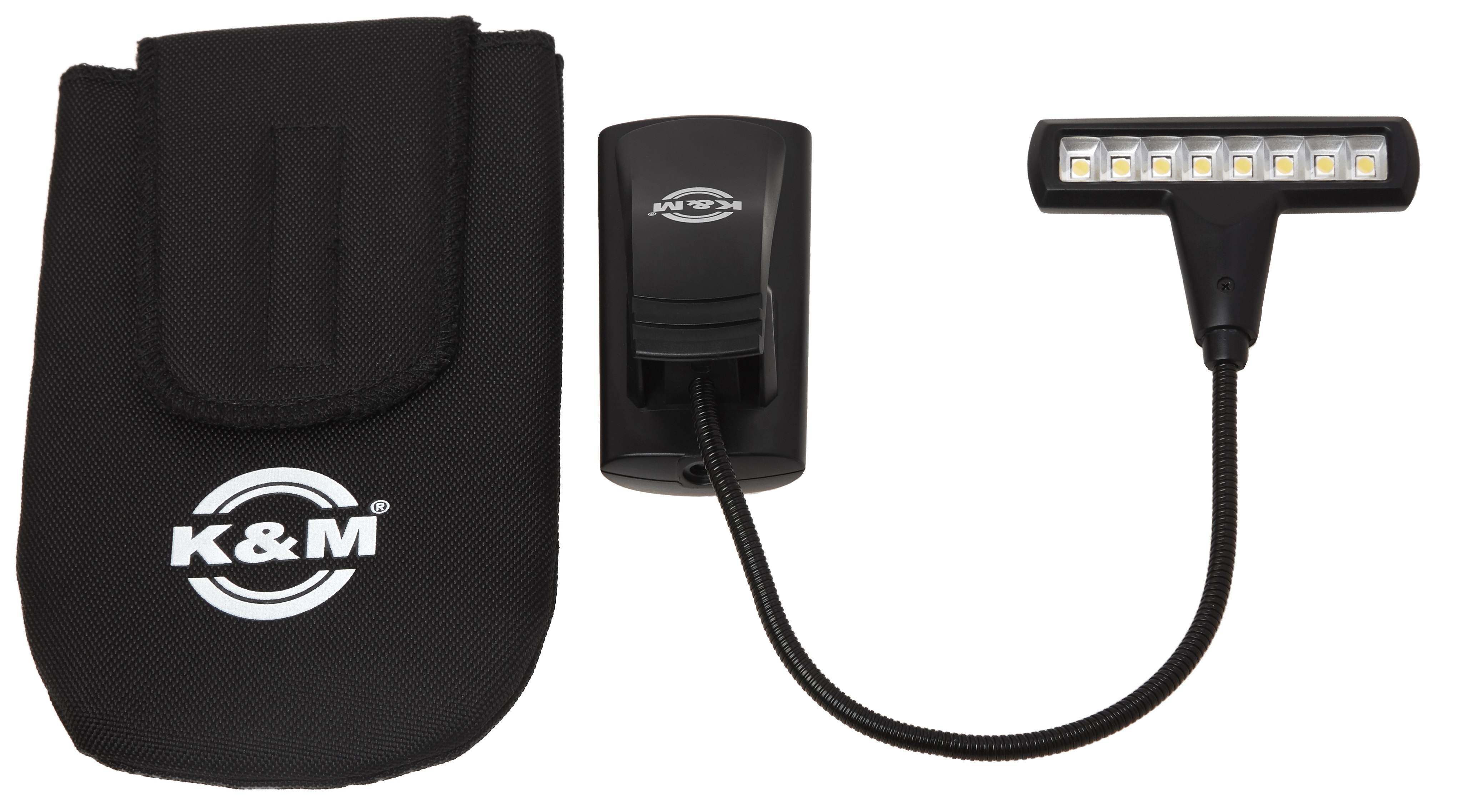 Lampička k notovému stojanu/ku klavíru Výkonná lampa LED v tvare písmena T osvetľuje vaše poznámky alebo nástroj pomocou ôsmich svetiel LED a dvoch nastavení jasu. Flexibilitu nastavenia zaručuje husí krk a mimoriadne široká spona s rozpätím 25 mm. Umožňuje tiež, aby svietidlo stálo samostatne. Napájanie je zabezpečené tromi batériami AAA (cca 20 hodín prevádzky) alebo sieťovým adaptérom (nie je súčasťou balenia).