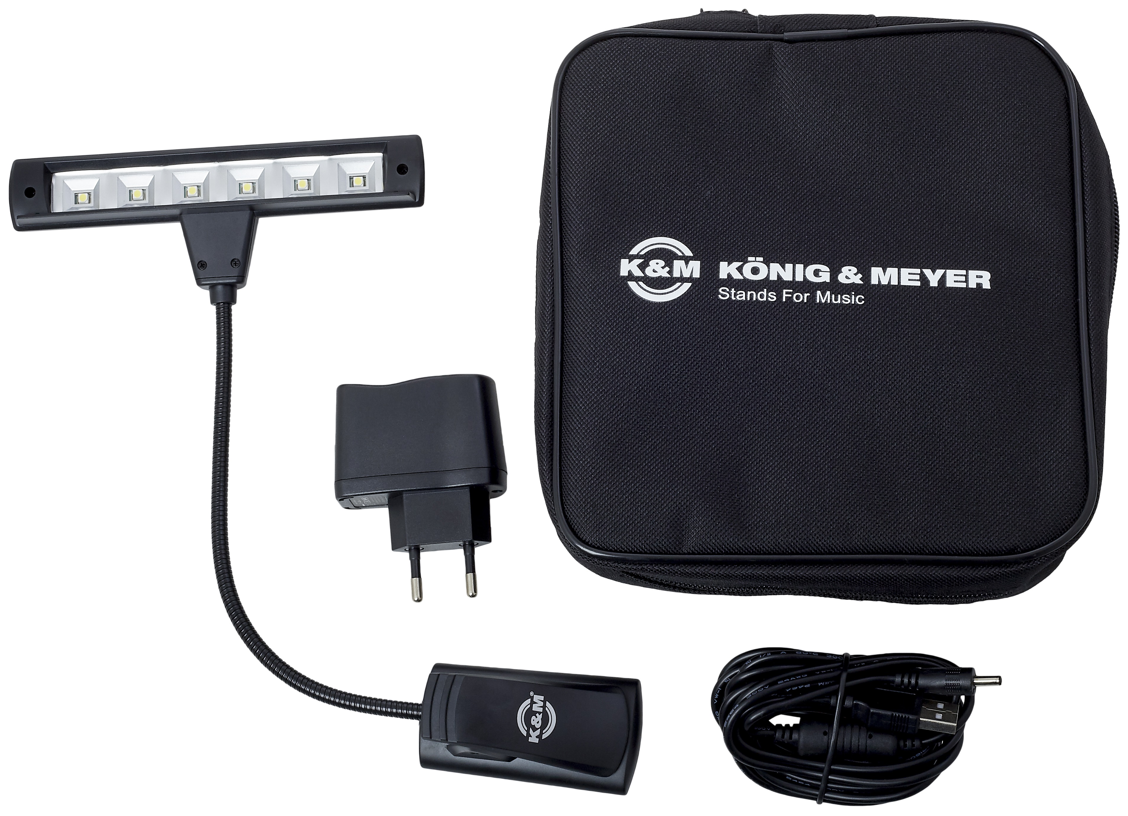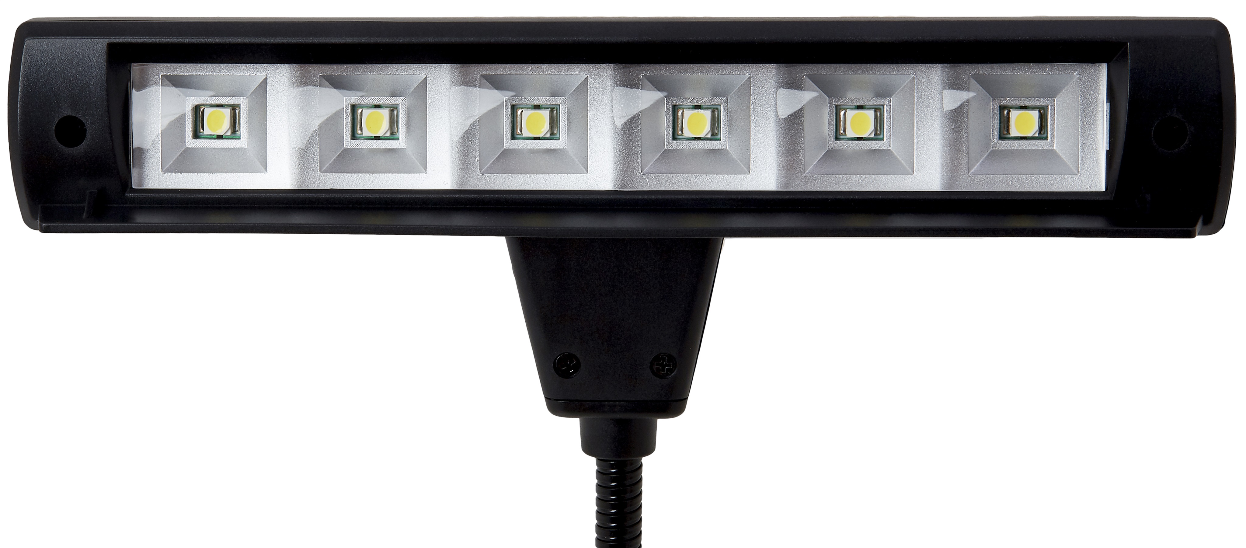Lampička k notovému stojanu/ku klavíru Stojanová lampa so šiestimi výkonnými, ale energeticky úspornými LED diódami. Intenzitu svetla možno voliť v dvoch stupňoch a vďaka flexibilnému husiemu krku a sklu proti oslneniu môžete ľahko nastaviť svetelný kužeľ presne tak, ako potrebujete. Súčasťou balenia sú tri batérie AAA, sieťový adaptér s trojmetrovým káblom a puzdro na prenášanie.
