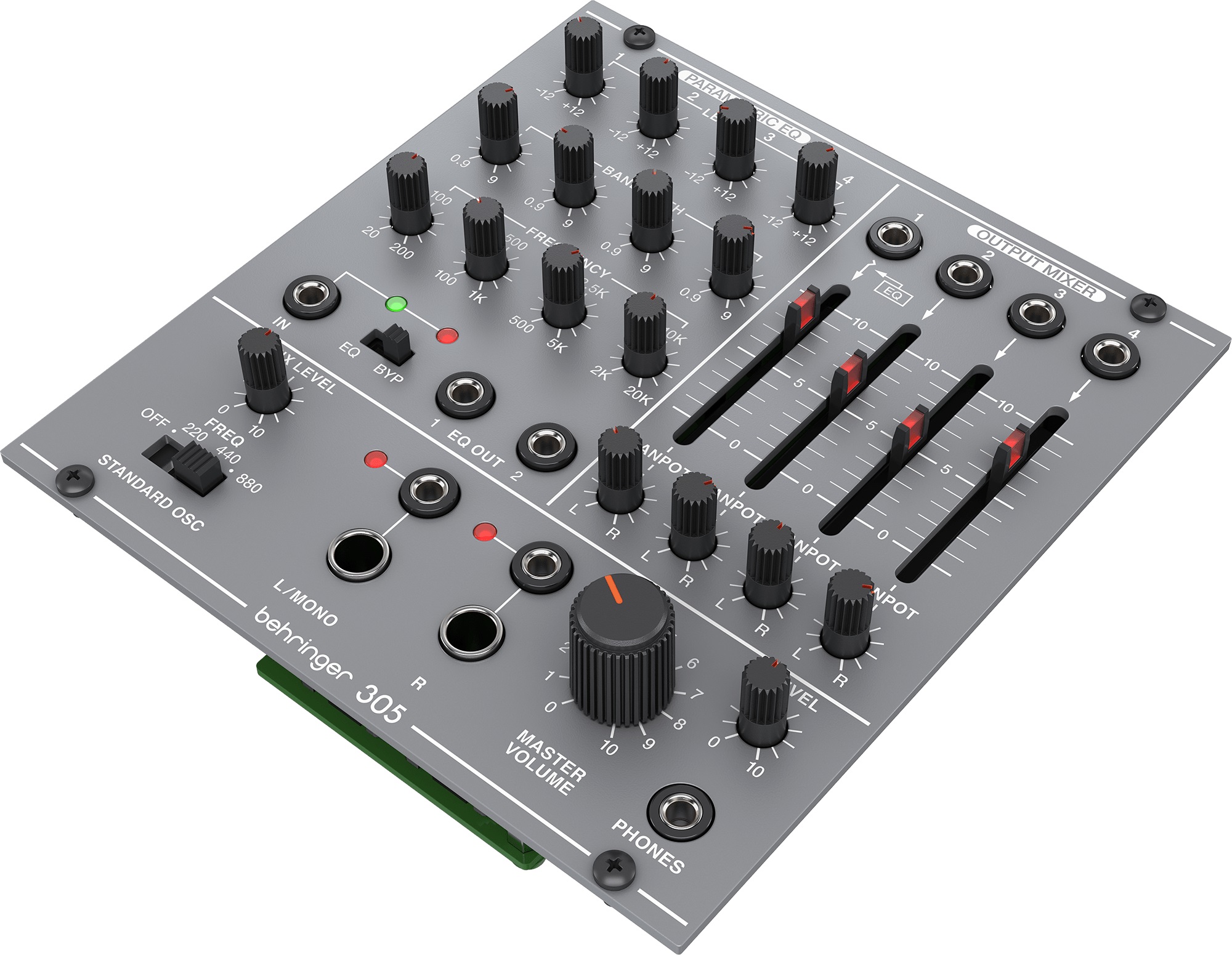 Eurorack modul Objavte legendárny zvuk 80. rokov s modulom Behringer 305 EQ/MIXER/OUTPUT. Tento modul je autentickou reprodukciou kombinácie parametrického EQ, mixéra/oscilátora a slúchadlového zosilňovača z pôvodného obvodu "System 100M" a je určený pre štandardný Eurorack kufor. Modul 305 EQ/MIXER/OUTPUT obsahuje 4-kanálovú sekciu EQ s ovládaním úrovne, šírky pásma a frekvencie, 4-vstupový mono mixér s pan a 2 nastaviteľnými mono/stereo master výstupmi, ladiaci oscilátor