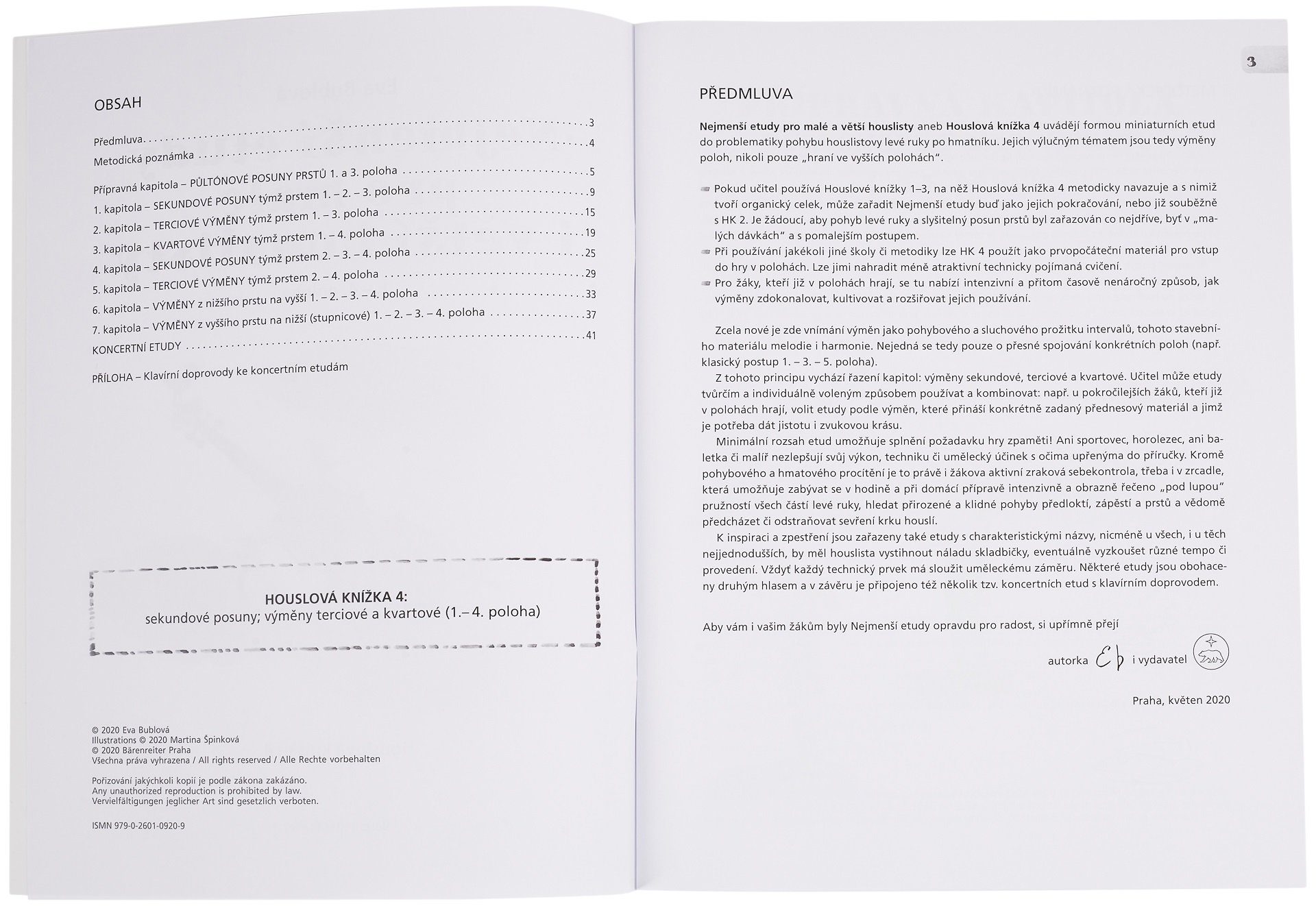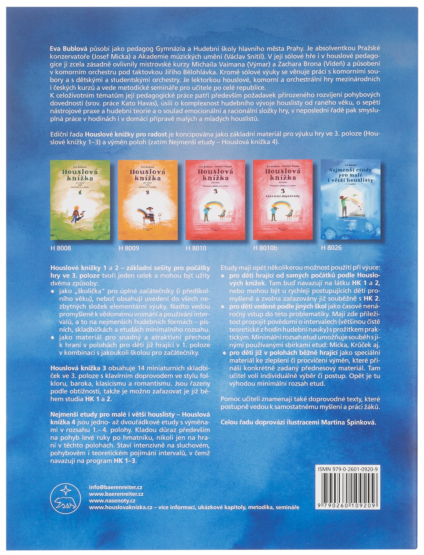 Škola hry na husliach Skúsená a obľúbená učiteľka Eva Bublová vo svojej najnovšej knihe Husle 4 sa zaoberá problematikou pohybu ľavej ruky huslistu na hmatníku. Výhradnou témou Najmenších etúd pre mladých a starších huslistov sú teda zmeny polôh (1.-4.), nielen "hra vo vyšších polohách". Úplne nové je tu vnímanie výmen ako motorickej a sluchovej skúsenosti intervalov. Najmenšie etudy metodicky nadväzujú na program husľových kníh 1 – 3, a to buď ako ich pokračovanie, alebo ich možno používať súbežne s husľov
