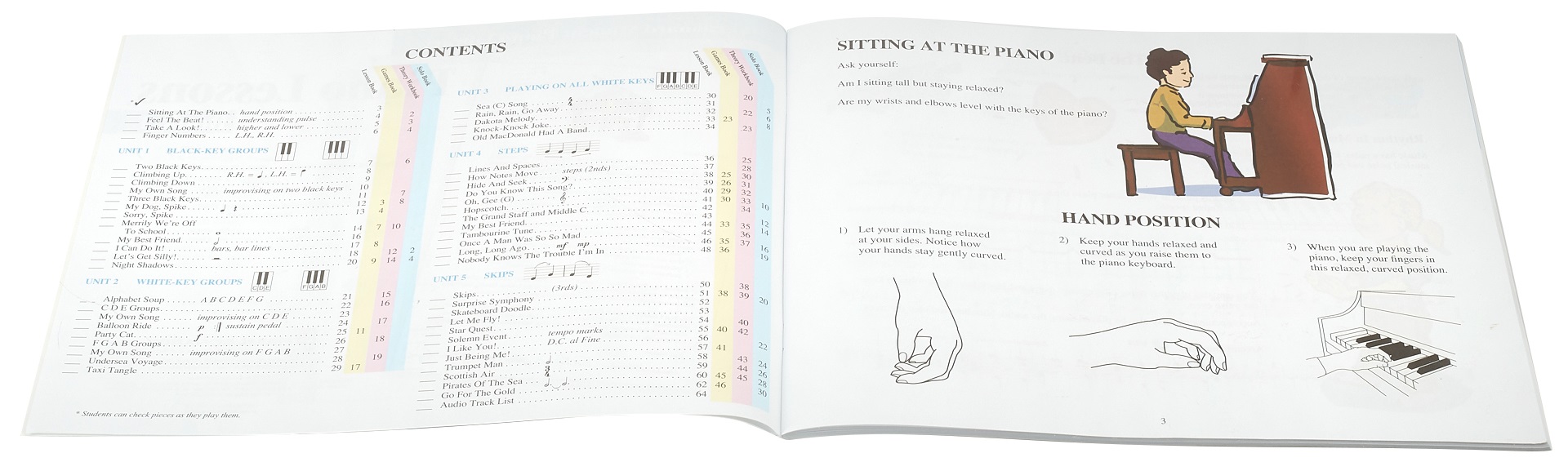 Škola hry na klavíri ŠTUDENTSKÁ KLAVÍRNA KNIŽNICA: KLAVÍRNE LEKCIE KNIHA 1 Táto kniha je ideálna na výučbu hry na klavír v súkromí aj v skupine. Tento zväzok sa zameriava na základy – napríklad správne sedenie pri klavíri, vnímanie rytmu a výšky tónu, rozloženie klávesov a intervalov.