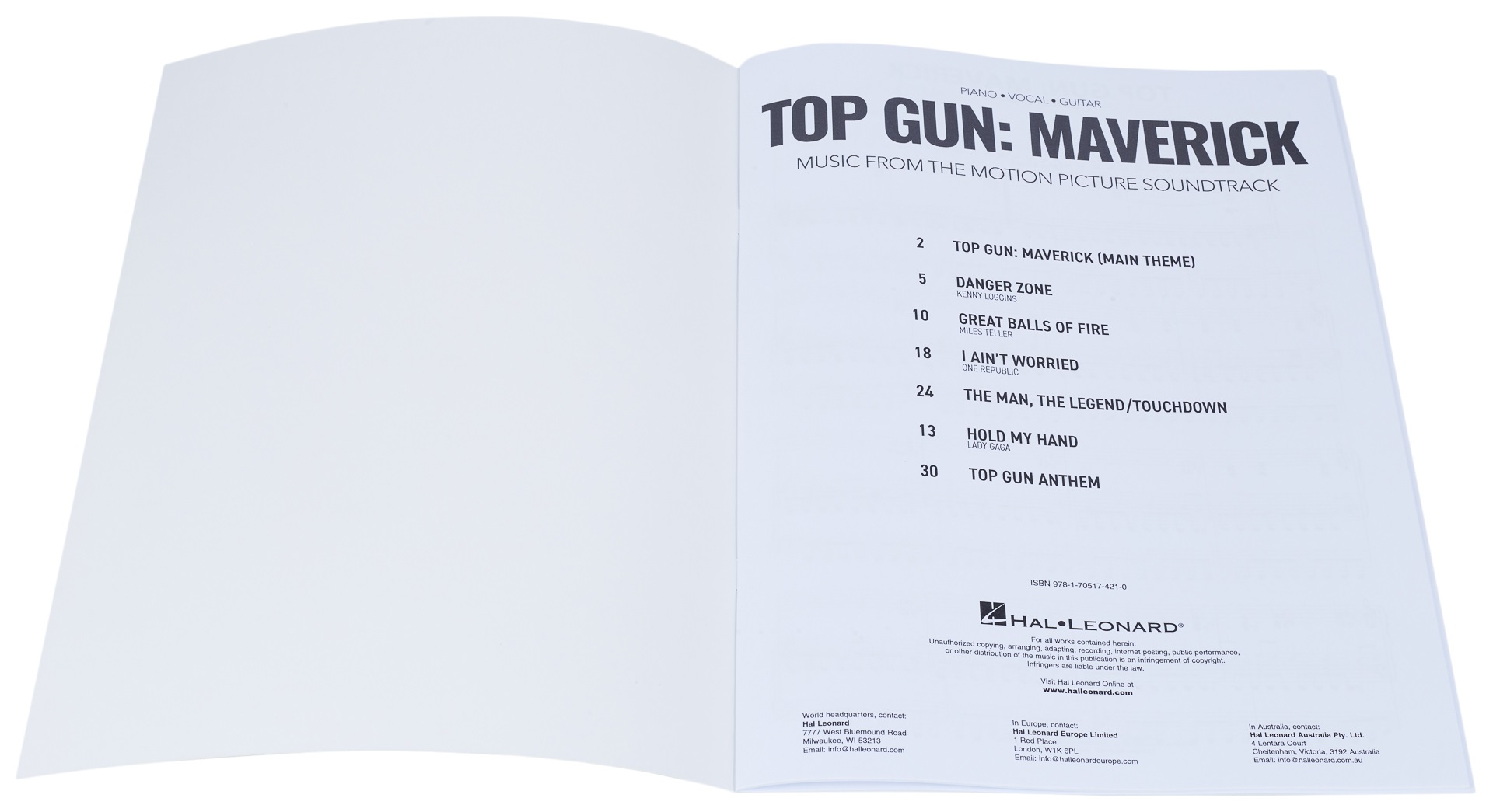 Noty pre klavír Táto publikácia obsahuje sedem piesní z filmu Top Gun: Maverick v úprave pre klavír a spev s akordovým sprievodom pre gitaru. Danger Zone (Kenny Loggins) – Great Balls of Fire (Miles Teller) – Hold My Hand (Lady Gaga) – I Ain't Worried (OneRepublic) – The Man, the Legend/Touchdown – Top Gun Anthem – Top Gun: Maverick (Main Theme).