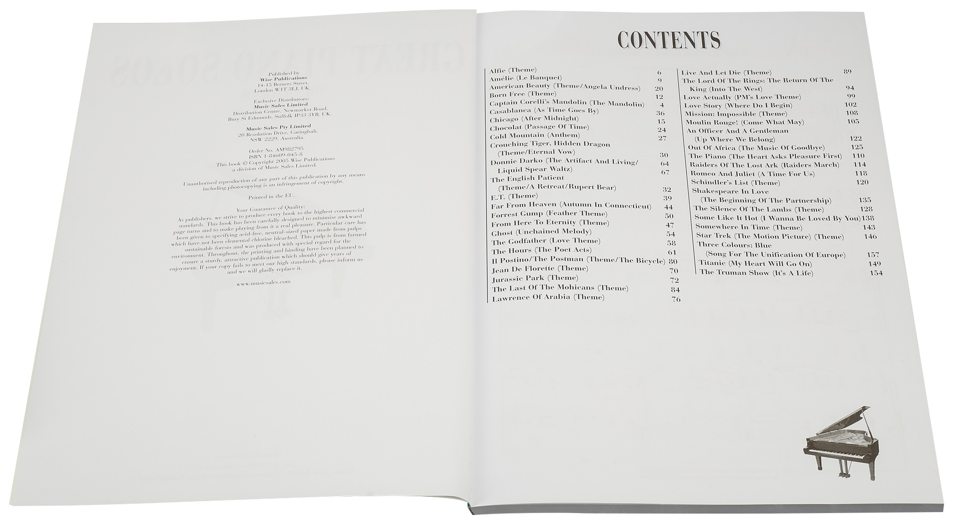 Noty pre klavír SKVELÉ KLAVÍRNE SÓLA – FILMOVÁ KNIHA Táto kniha obsahuje noty skladieb pre klavír. Zahrnuté sú najznámejšie diela klasickej, popovej, džezovej, bluesovej alebo filmovej hudby. Zoznam kusov: Čas pre nás (Romeo a Júlia) [Rota, Nino] Po polnoci (Chicago) [Elfman, Danny] Alfie (Alfie) [Bacharach, Burt] Americká krása/Angela Undress (American Beauty) [Newman, Thomas] Hymna (Cold Mountain) [Yared, Gabriel] Ako plynie čas (Casablanca) [Hupfield, Herman] Jeseň v Connecticute (ďaleko od neba) [Bernst