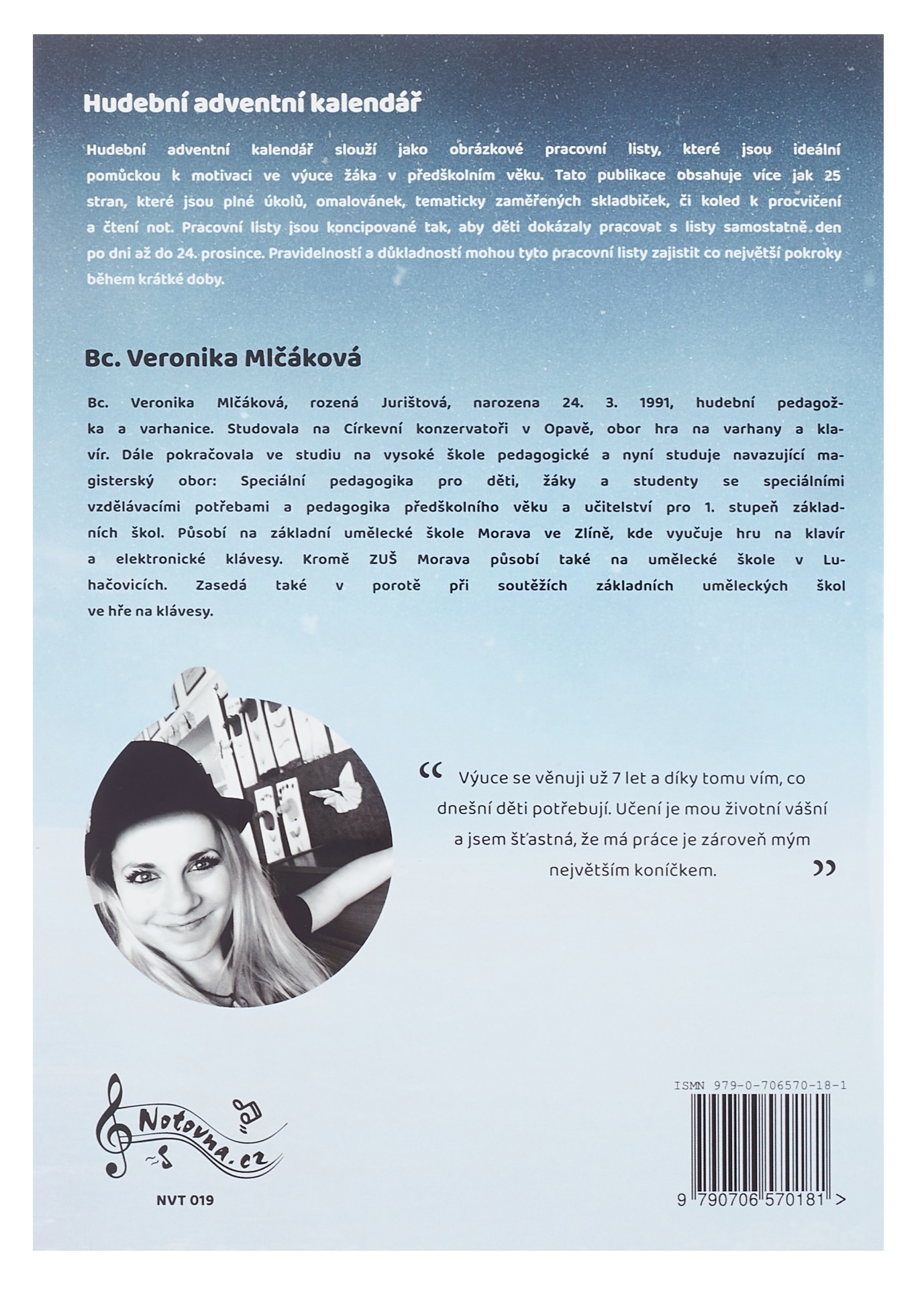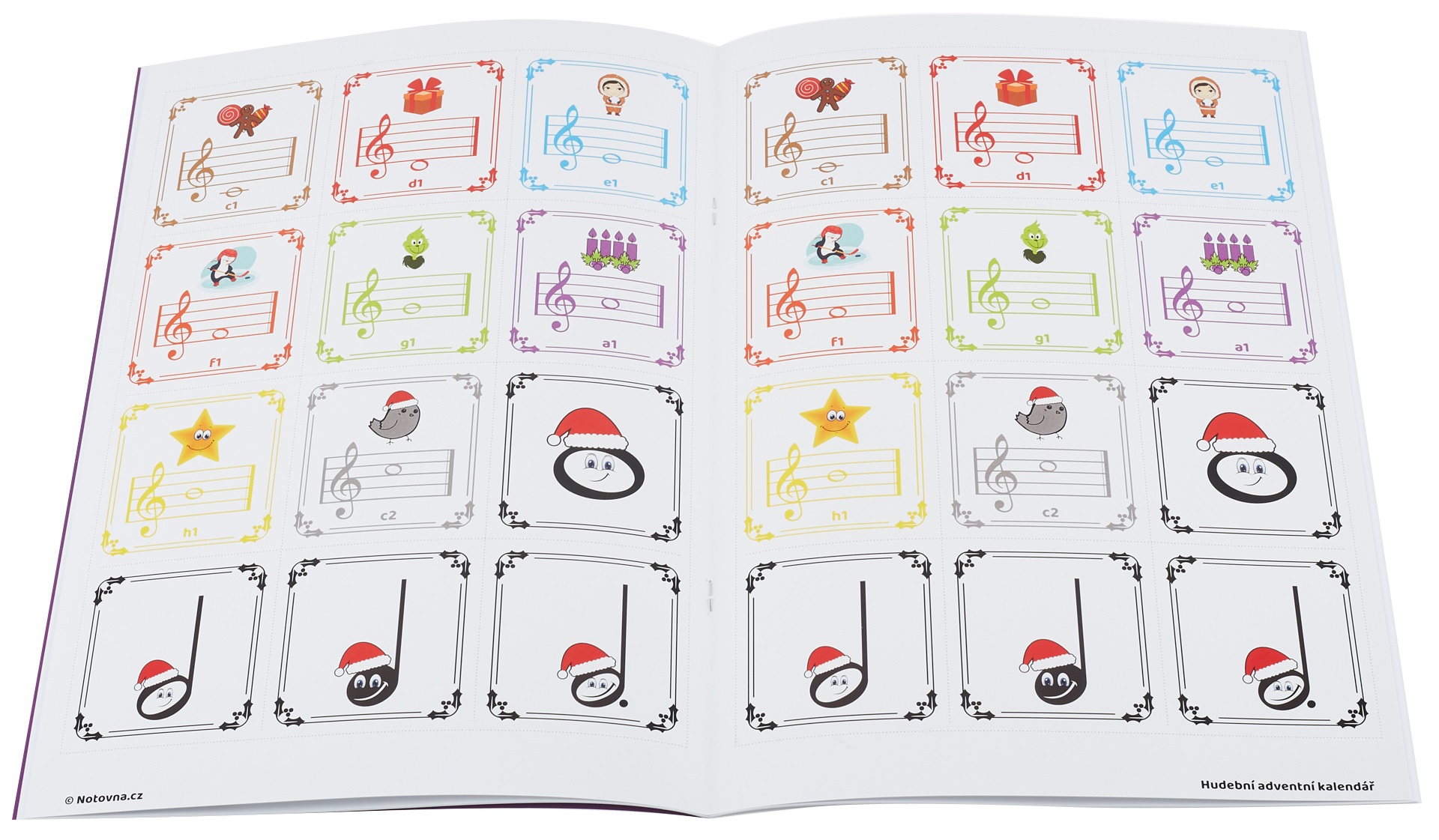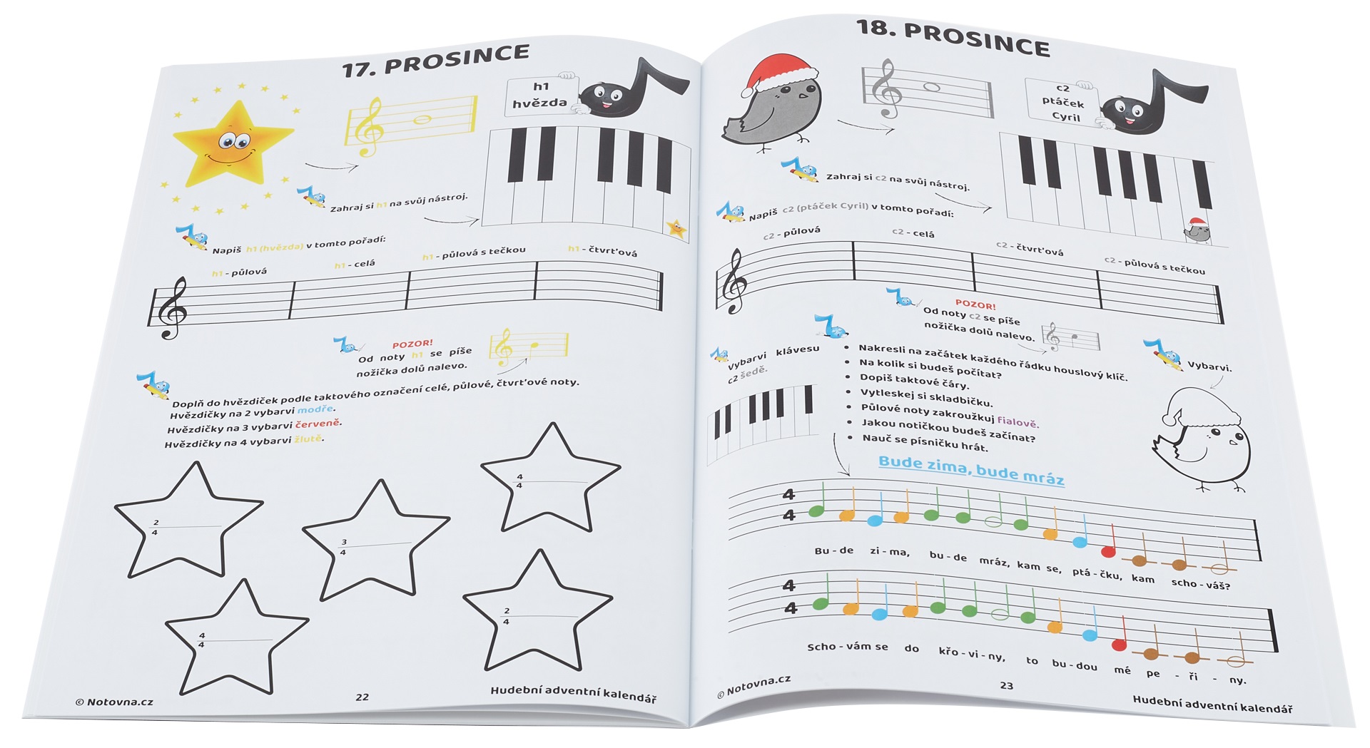 Hudobná náuka Plnofarebná publikácia Hudobný adventný kalendár slúži ako obrázkové pracovné listy, ktoré sú ideálnym nástrojom na motiváciu učenia žiakov v predškolskom a ranom školskom veku. Táto publikácia obsahuje viac ako 25 strán, ktoré sú plné cvičení, maľovaniek, tematických piesní alebo kolied na precvičovanie a čítanie hudby. Pracovné listy sú navrhnuté tak, aby deti mohli pracovať s pracovnými listami samostatne deň po dni až do 24. decembra. Pravidelnosť a dôkladnosť týchto pracovných listov môže