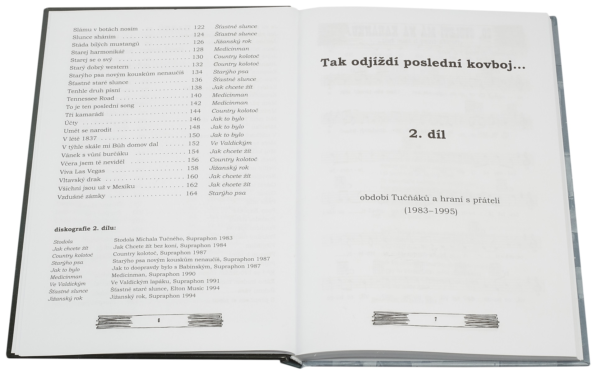Spevník Osemdesiat známych i menej známych piesní Michala Tučného s Tučniakmi a priateľmi (Budem žiť večne, Ako chceš žiť bez koní, Kozmický tulák, Rád sa brodím rosou, Všetci sú už v Mexiku a ďalšie). Noty, texty, akordy, melódie. Veľké množstvo fotografií. Obálka: Karel Kopic.