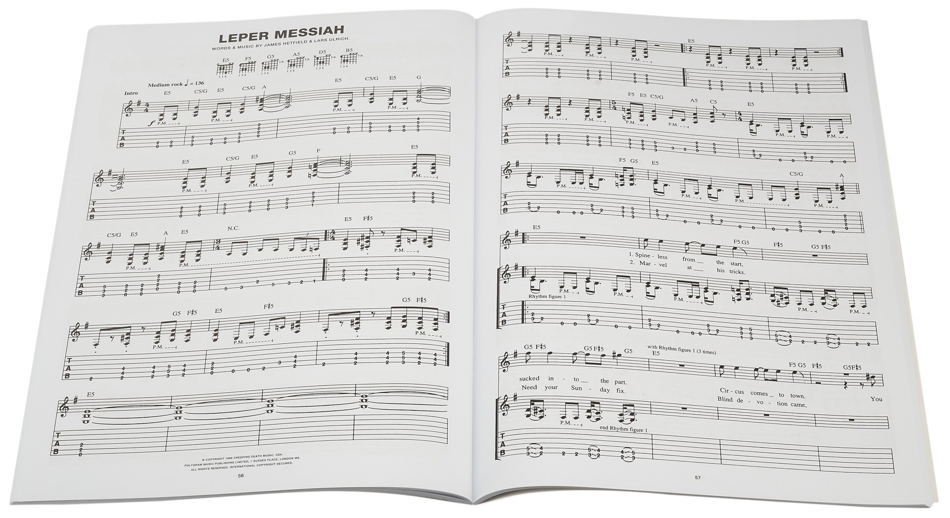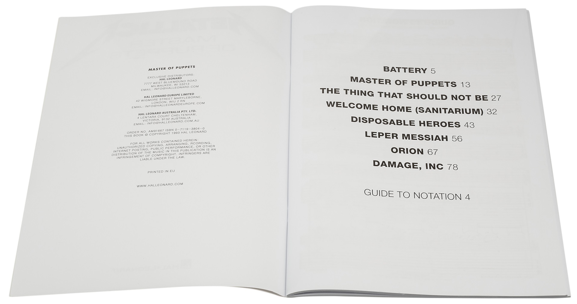 Spevník METALLICA – MASTER OF PUPPETS Táto kniha obsahuje piesne z albumu Master of Puppets od skupiny Metallica. Ku každej skladbe je nahraný gitarový part v tabuľkovej a notovej osnove, text a akordové značky. Zoznam skladieb: Batéria Poškodenie Inc. Hrdinovia na jedno použitie Malomocný Mesiáš Majster bábok Orion Vec, ktorá by nemala byť Vitajte doma (Sanitarium)