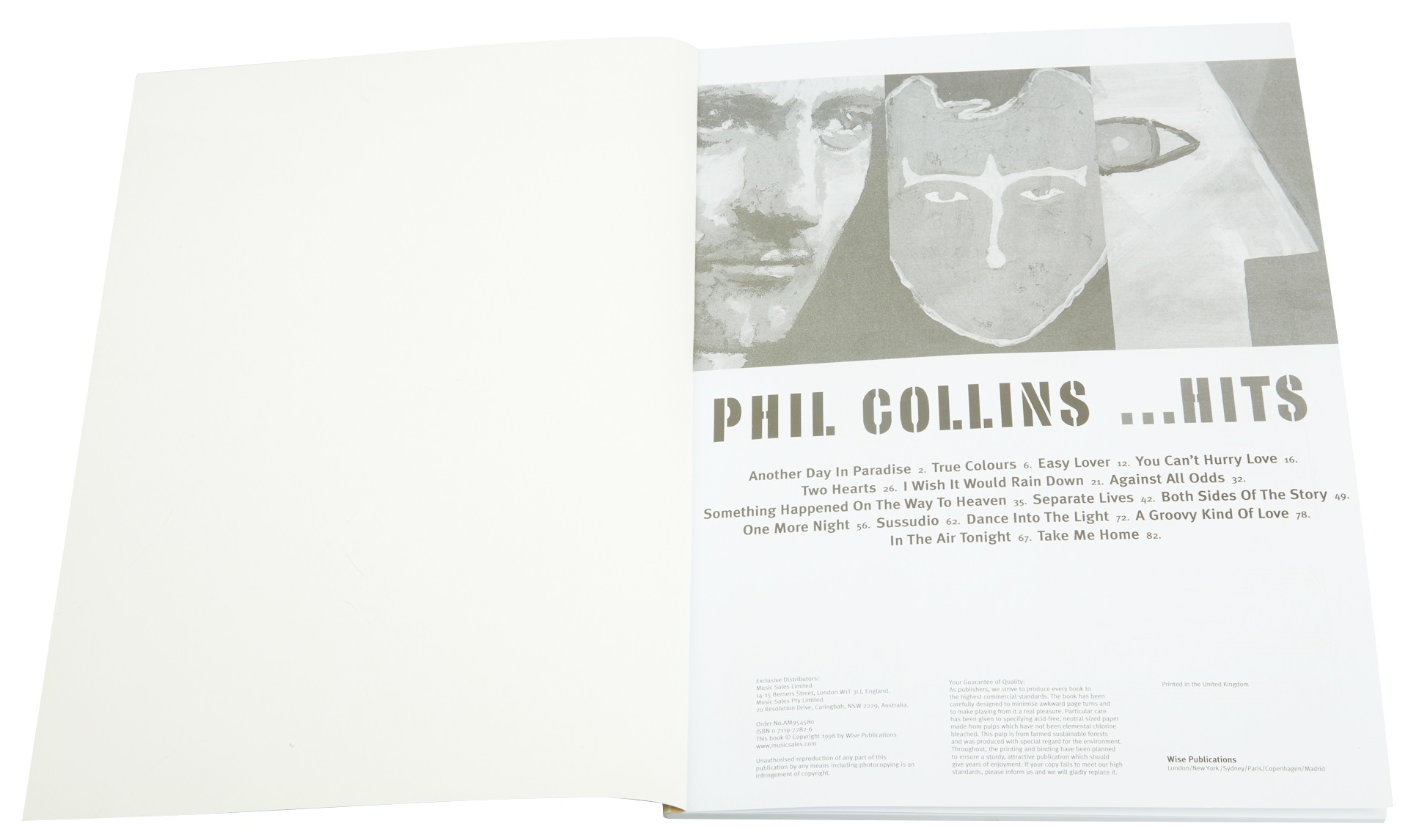 Spevník PHIL COLLINS: HITY Táto kniha obsahuje najlepšie piesne Phila Collinsa. Každá skladba má klavírny part, gitarové akordy a text s melódiou. Zoznam skladieb: A Groovy Kind Of Love Proti všetkým náhodám Ďalší deň v raji Oba druhy príbehu Tanec do svetla Ľahký milenec Želám si, aby pršalo In The Air Tonight Ešte jedna noc Oddelené životy Niečo sa stalo na ceste do neba Sussudio Vezmi ma domov Pravé farby Dve srdcia Lásku nemožno urýchliť