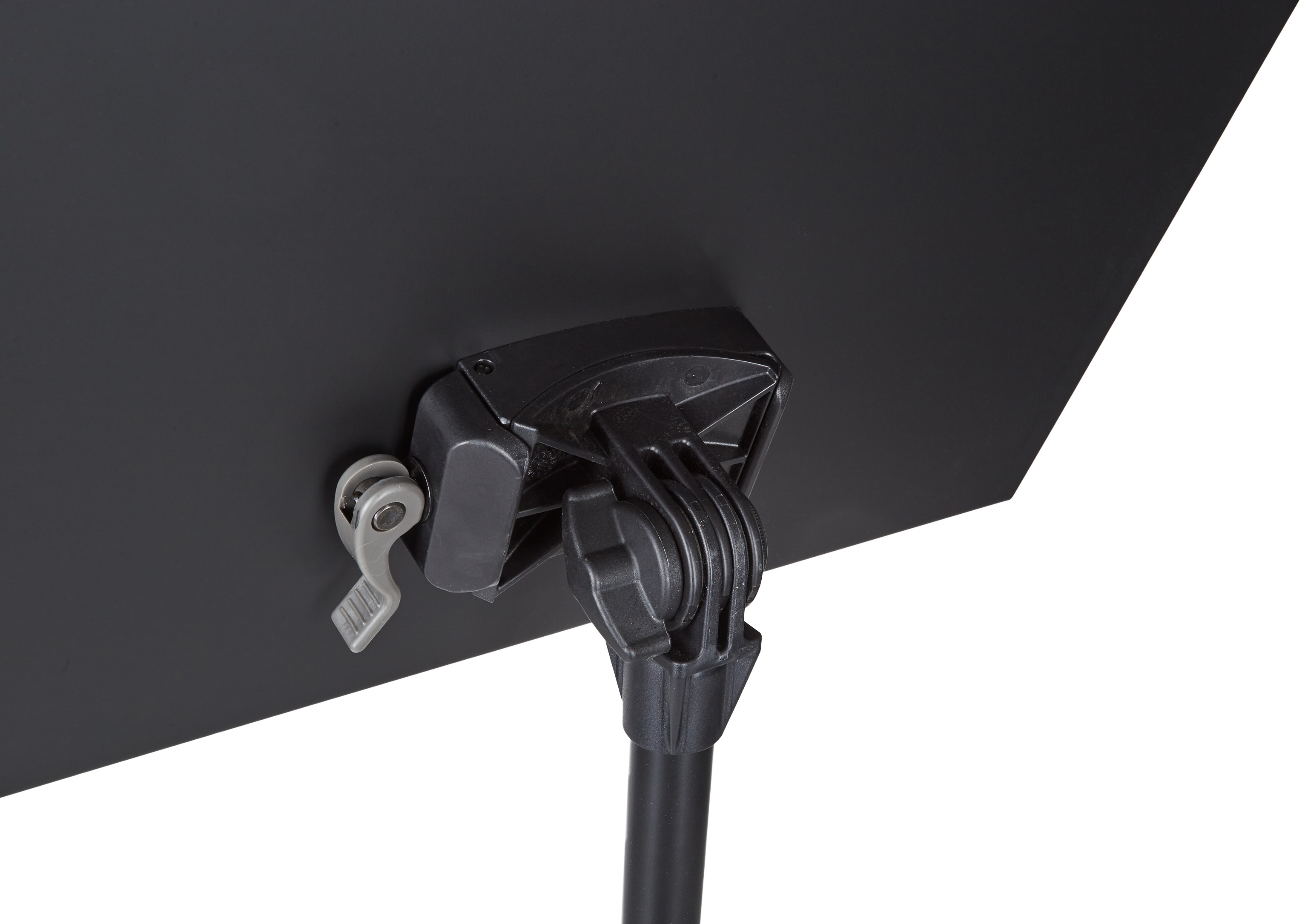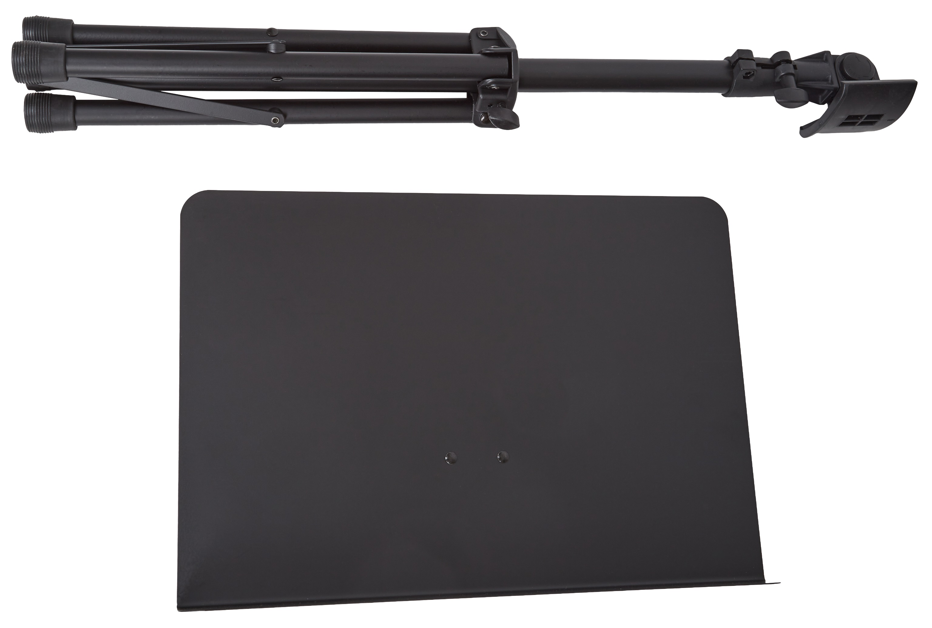 Notový stojan Tento oceľový stojan je vhodný najmä na orchestrálne hranie. Je vybavený dvojdielnou skladacou konštrukciou, stabilnou trojnožkovou základňou a pevným perforovaným notovým stojanom s nastaviteľným uhlom sklonu. Špecifikácie: – Rozmery dosky: 490 x 340 x 50 mm