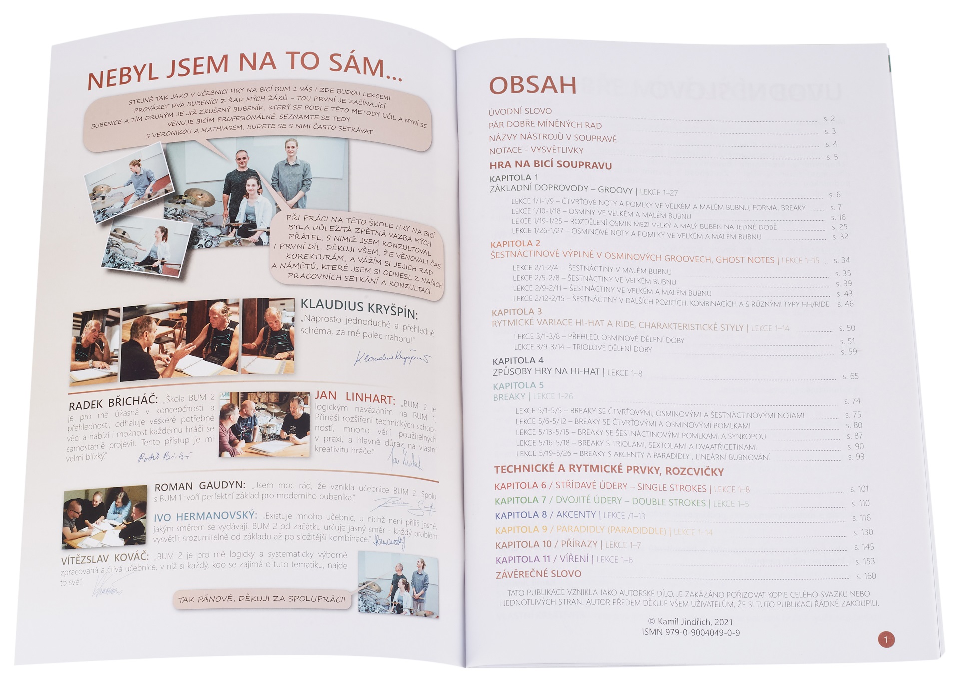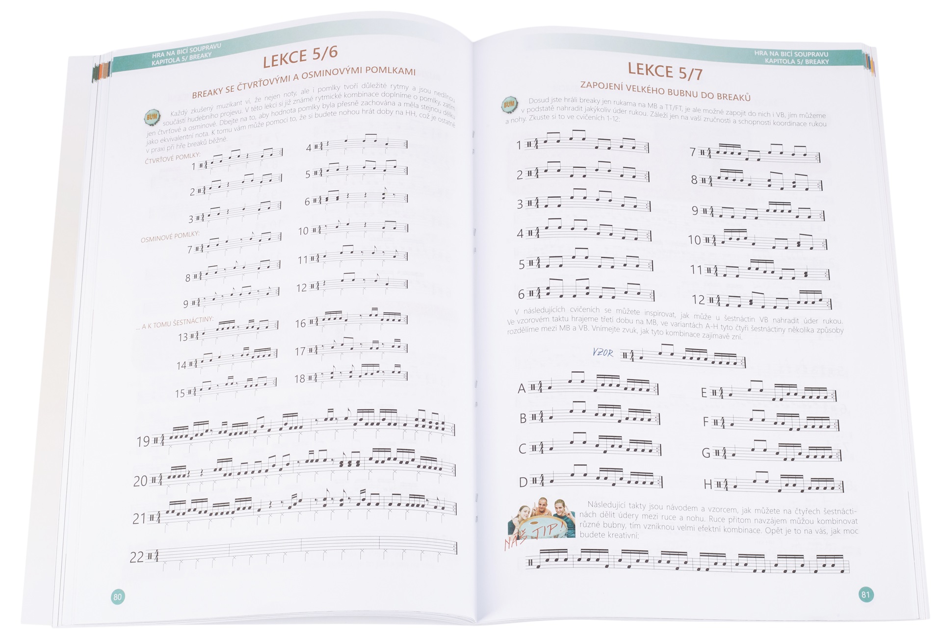 Škola hry na bicích Druhý diel obľúbenej učebnice o bicích nástrojoch. Obsahuje 145 lekcií v 11 tematických kapitolách. Viac ako 300 rytmických sprievodov – groovov, viac ako 300 breakov, viac ako 500 rozcvičiek, technických a rytmických cvičení, jednoduchých a dvojitých úderov, prízvukov, paradiddlov, akcentov, swirlingov, interaktívnych cvičení na rozvoj vlastnej kreativity a improvizácie. OBSAH – učebnica je tematicky rozdelená do dvoch častí: HRANIE NA BICIE SÚPRAVU: – základné sprievody – groovy – výpl