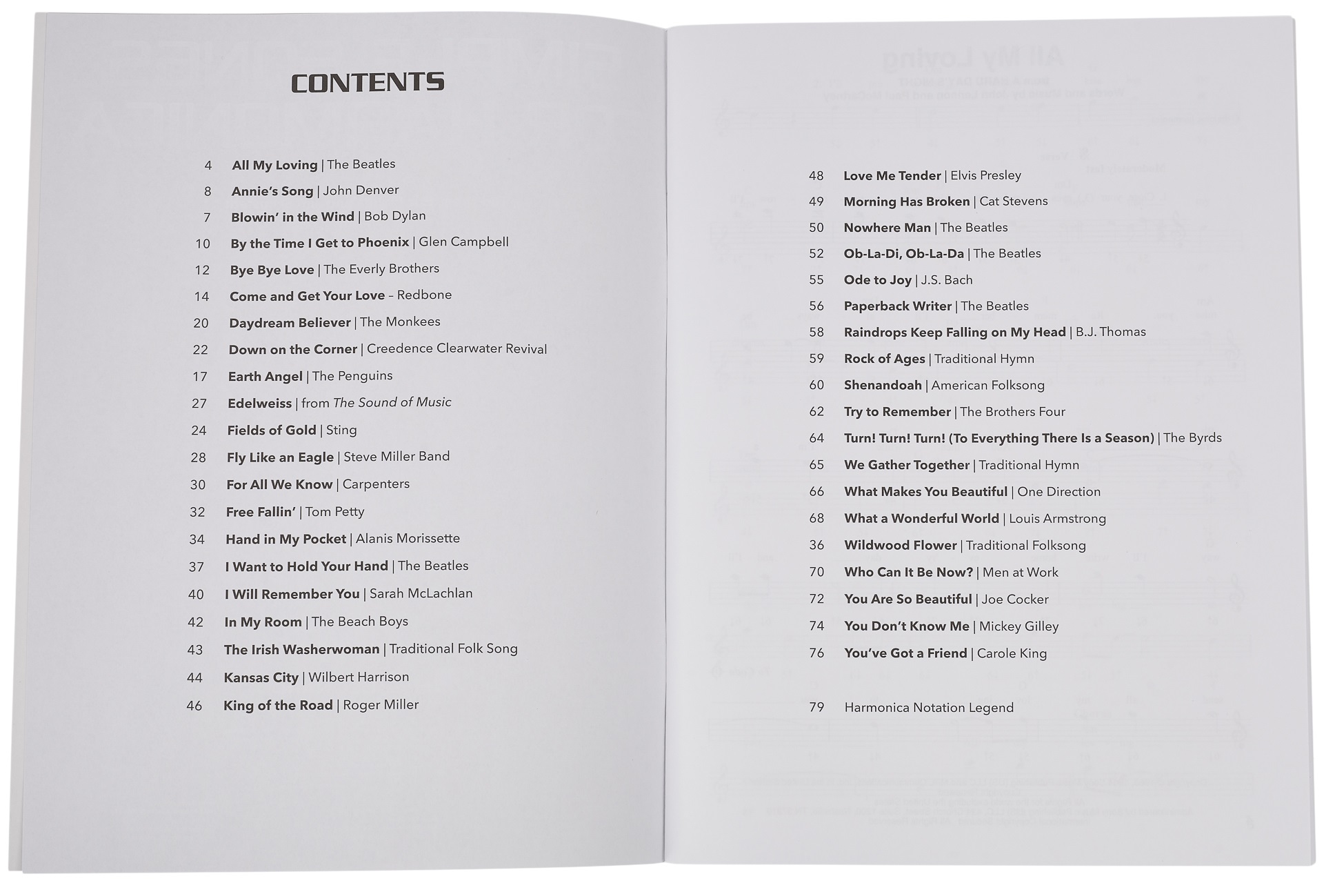 Noty pre fúkaciu harmoniku Publikácia Simple Songs for Harmonica ponúka 40 skladieb v jednoduchých aranžmánoch pre dychovú diatonickú harmoniku C dur. Skladby sú napísané v štandardnom notovom zápise a tabuľkovej forme pre harmoniku, s textom a akordovými symbolmi. Zoznam skladieb: Hand In My Pocket 2. Wildwood Flower 3. I Will Remember You 4. All My Loving 5. Óda na radosť 6. Annie's song 7. Ráno sa rozbilo 8. Rock of Ages 9. Blowin' in the Wind 10. The Irish Washerwoman 11. We Gather Together 12. Shenando